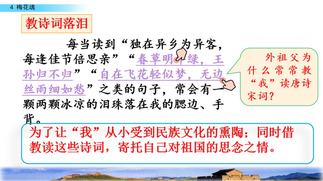唐诗宋词是中华民族的文化瑰宝,渗透着中华民族的民族精神, 外祖父常常教“我”读这些诗词,目的是使“我”从小受到民族文化的熏陶,同时借教“我”读这些诗词,寄托自己对祖国的思念之情。