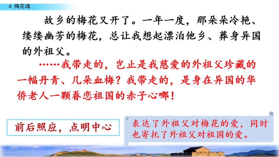 开头写由梅花想到外祖父,结尾又写从梅花图想到外祖父眷恋祖国的心。这样首尾呼应,更加突出了身在异国的华侨老人思念祖国的强烈情感。