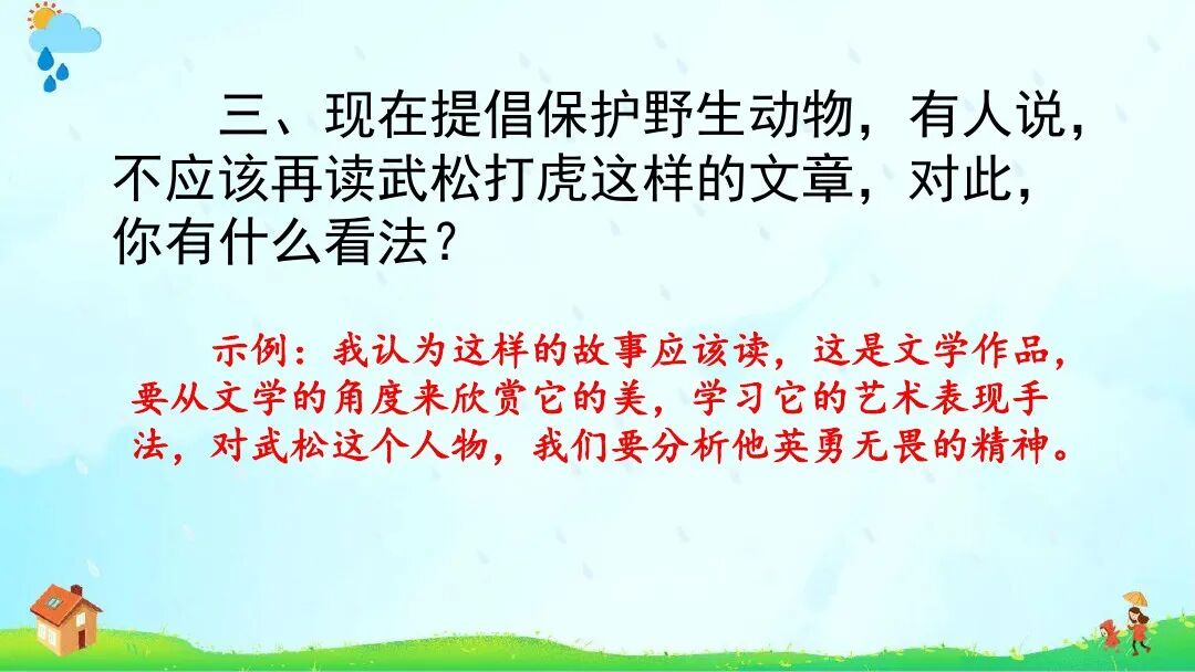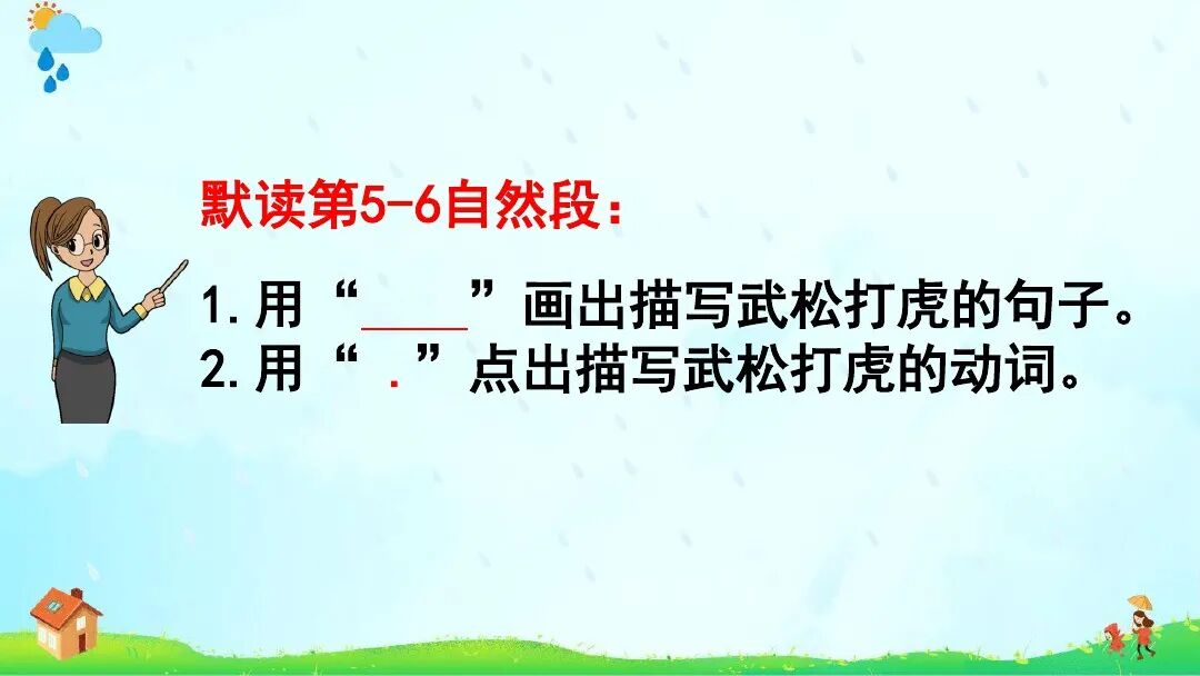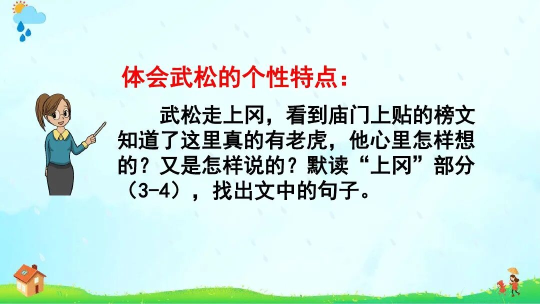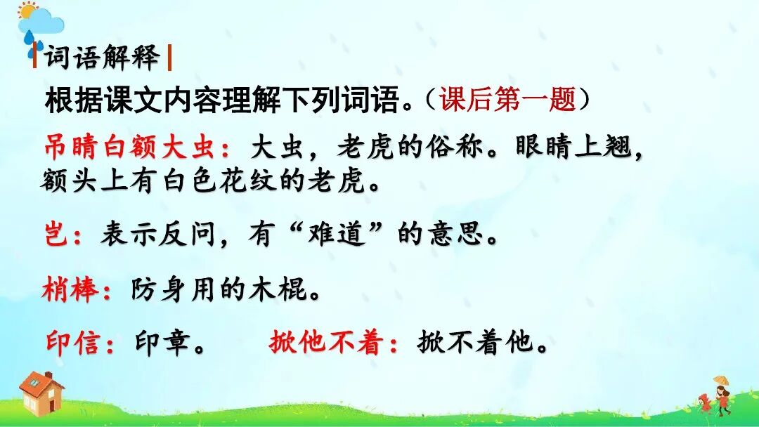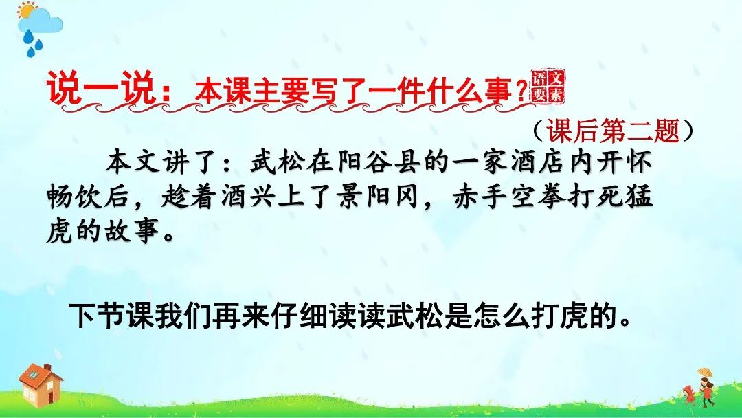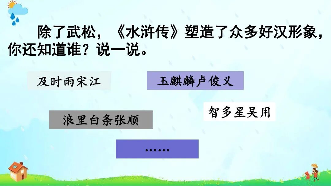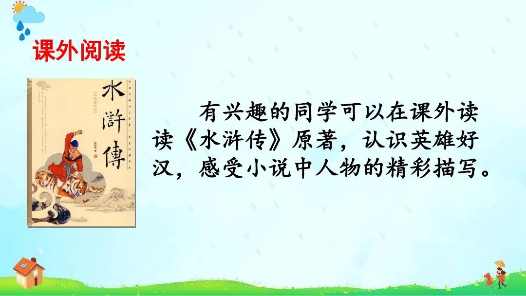 《景阳冈》∶增加“梢棒”“抡”“疏软”注释;课后资料袋图“浪里白条张顺”改为“小旋风柴进”。