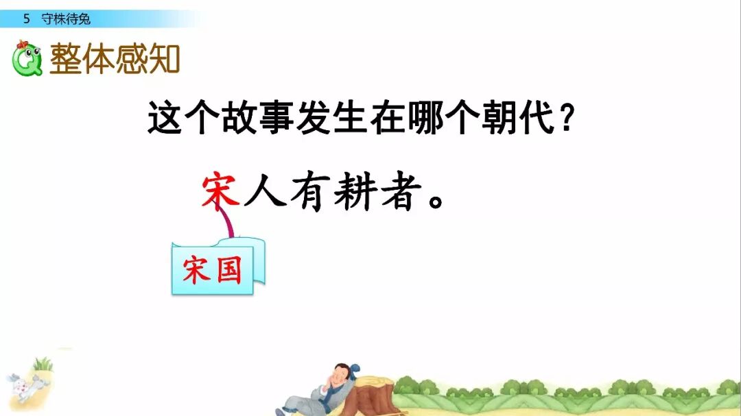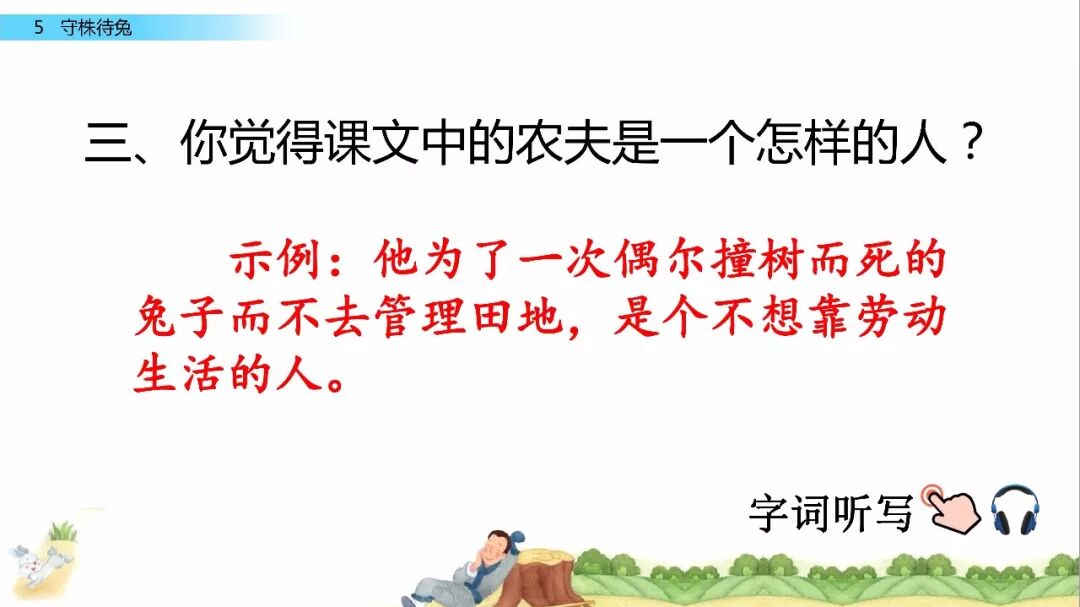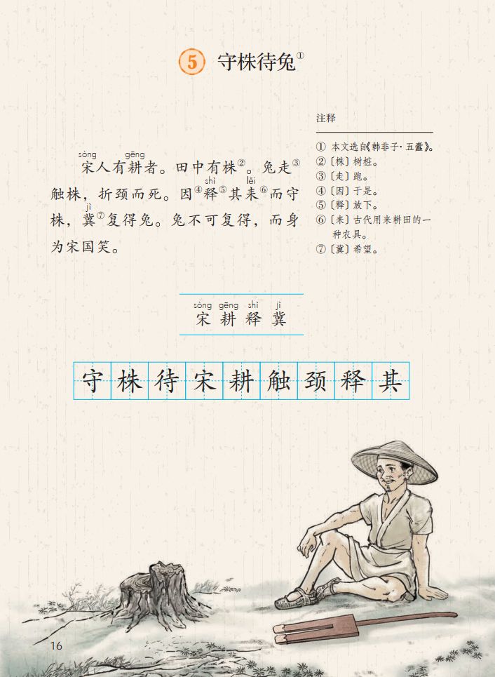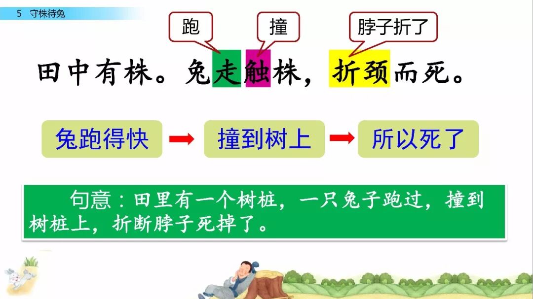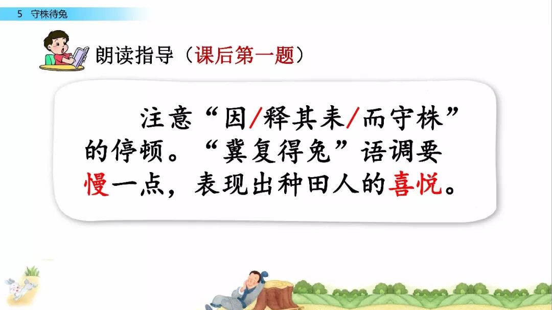 一、给下列加点字选择正确的读音,用“ ”标出。 宋(sònɡ shònɡ) 冀( jì yì ) 颈(jǐn jǐnɡ ) 释(sì shì) 守(shǒu shuǒ) 触( chù cù ) 二、比一比,组词语。 宋( ) 释( ) 颈( ) 待( ) 守( ) 彩( ) 劲( ) 诗( ) 三、写出下列句子的意思。 1.因释其耒而守株。 2.冀复得兔。 四、阅读课文,回答问题。 宋人有耕田者。田中有株,兔走触株,折颈而死。因释其耒而守株,冀复得兔。兔不可复得,而身为宋国笑。 1、解释文中加点的词。 ①兔走触株( ) ②因释其耒而守株( ) ③冀复得兔( ) ④而身为宋国笑( ) 2、下列句子中加点的“为”与“而身为宋国笑”中的“为”意思相同的一项是( ) A、舌一吐而二虫尽为所吞 B、为人谋而不忠乎 C、始悟为山市 D、此何遽不为福乎 3、翻译文中画“ ”的句子。 4、为什么宋人不会再得到兔子? 五、如果你是种田人的朋友,你会怎么劝说他? 参考答案 一、 sònɡ jì jǐnɡ shì shǒu chù 宋 冀 颈 释 守 触 二、 宋(宋朝) 释(解释) 颈(颈项) 待(等待) 守(守门) 彩(彩色) 劲(劲头) 诗(诗人) 三、 1.因此,种田人就放下手中的农具,守在树桩子旁边。 2.种田人满脑子想的都是,再有一只兔子撞死在树桩上,自己白捡个大兔子。 四、 1. ① 跑 ② 放下 ③ 希望 ④ 自己 2. A 3.兔子是不会再得到了,自己却被宋国人所耻笑。 4. 因为“兔走触株,折颈而死”只是一个偶然现象。 五、 赶紧去种田吧。你的田地都荒芜了,再不种田,来年你吃什么?兔子撞死的事情,是百年难得一遇的稀奇事,不可能经常发生,靠等兔子过日子,是极其愚蠢的行为。