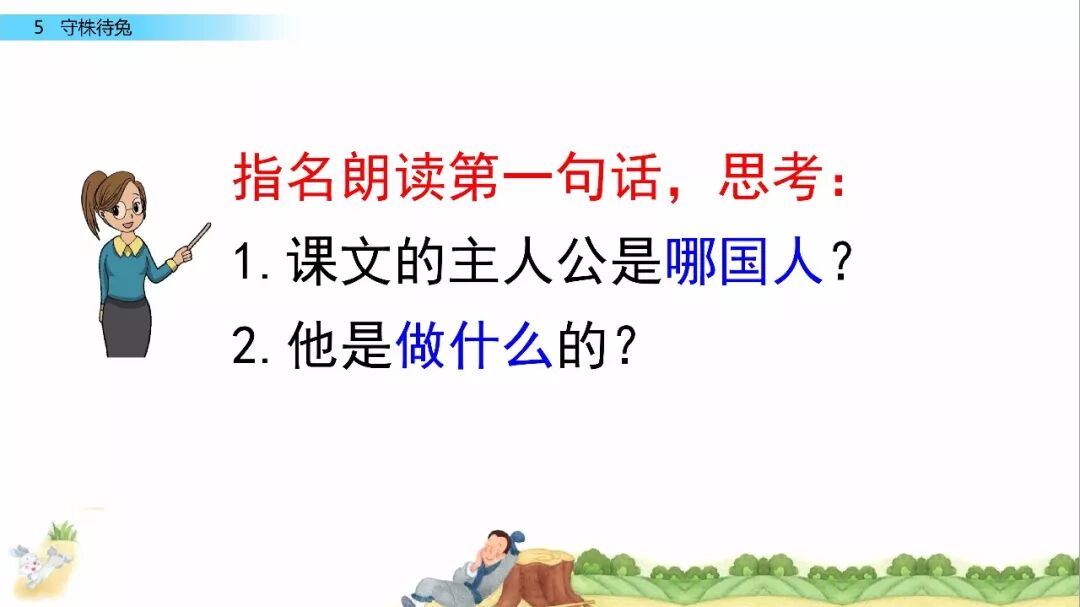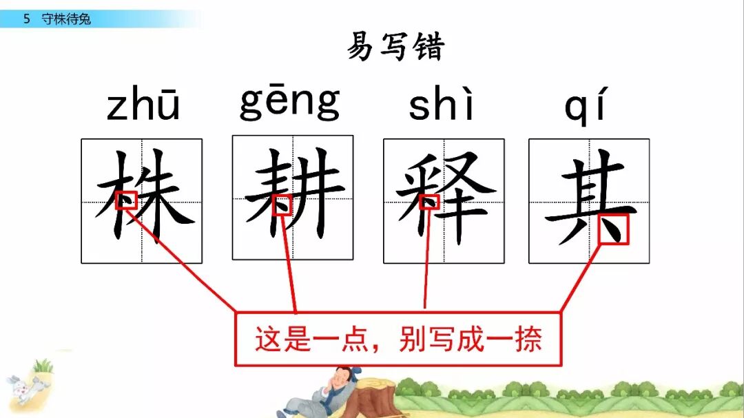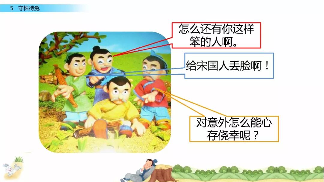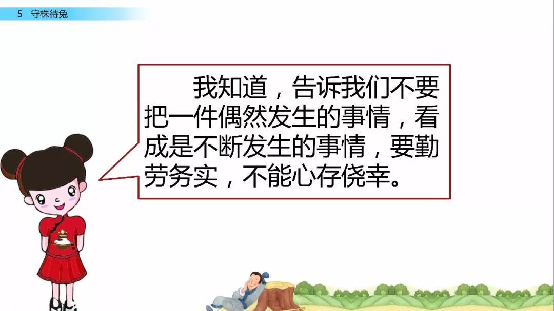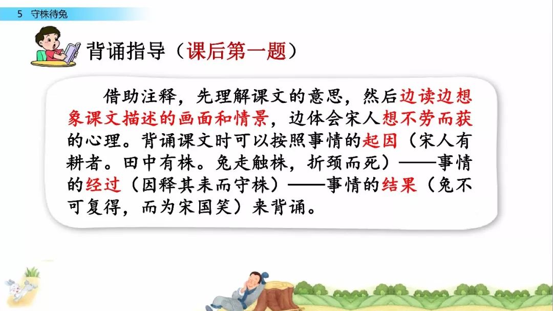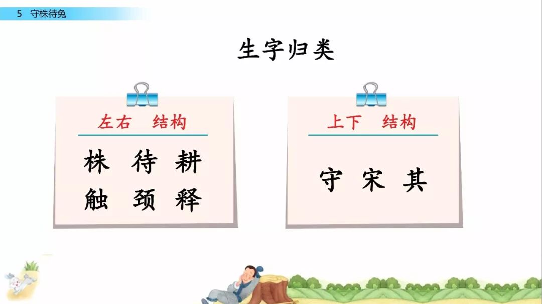 一、给下列加点字选择正确的读音,用“ ”标出。 宋(sònɡ shònɡ) 冀( jì yì ) 颈(jǐn jǐnɡ ) 释(sì shì) 守(shǒu shuǒ) 触( chù cù ) 二、比一比,组词语。 宋( ) 释( ) 颈( ) 待( ) 守( ) 彩( ) 劲( ) 诗( ) 三、写出下列句子的意思。 1.因释其耒而守株。 2.冀复得兔。 四、阅读课文,回答问题。 宋人有耕田者。田中有株,兔走触株,折颈而死。因释其耒而守株,冀复得兔。兔不可复得,而身为宋国笑。 1、解释文中加点的词。 ①兔走触株( ) ②因释其耒而守株( ) ③冀复得兔( ) ④而身为宋国笑( ) 2、下列句子中加点的“为”与“而身为宋国笑”中的“为”意思相同的一项是( ) A、舌一吐而二虫尽为所吞 B、为人谋而不忠乎 C、始悟为山市 D、此何遽不为福乎 3、翻译文中画“ ”的句子。 4、为什么宋人不会再得到兔子? 五、如果你是种田人的朋友,你会怎么劝说他? 参考答案 一、 sònɡ jì jǐnɡ shì shǒu chù 宋 冀 颈 释 守 触 二、 宋(宋朝) 释(解释) 颈(颈项) 待(等待) 守(守门) 彩(彩色) 劲(劲头) 诗(诗人) 三、 1.因此,种田人就放下手中的农具,守在树桩子旁边。 2.种田人满脑子想的都是,再有一只兔子撞死在树桩上,自己白捡个大兔子。 四、 1. ① 跑 ② 放下 ③ 希望 ④ 自己 2. A 3.兔子是不会再得到了,自己却被宋国人所耻笑。 4. 因为“兔走触株,折颈而死”只是一个偶然现象。 五、 赶紧去种田吧。你的田地都荒芜了,再不种田,来年你吃什么?兔子撞死的事情,是百年难得一遇的稀奇事,不可能经常发生,靠等兔子过日子,是极其愚蠢的行为。