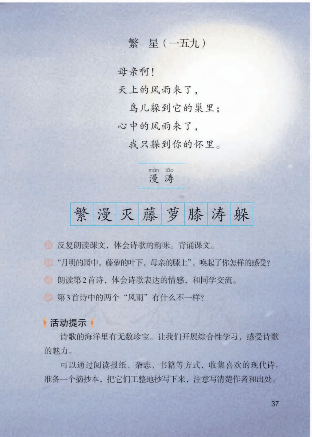 2.体会情感:母亲给予我们生命,养育我们长大,趴在母亲的膝上感受到什么呢?