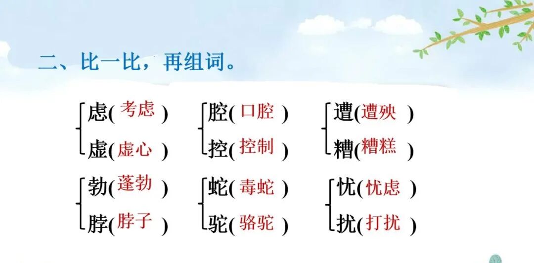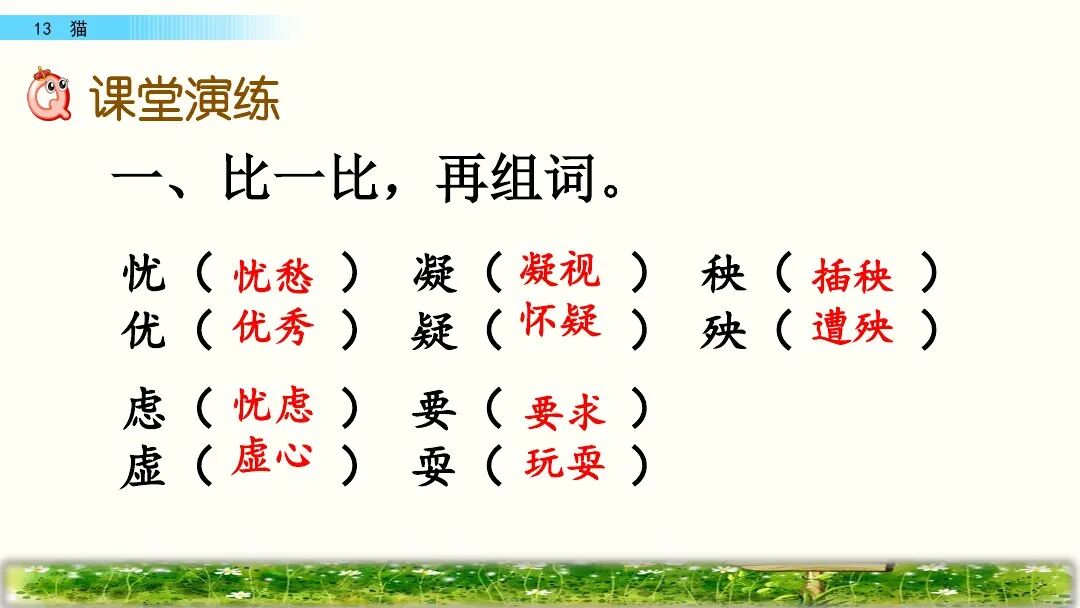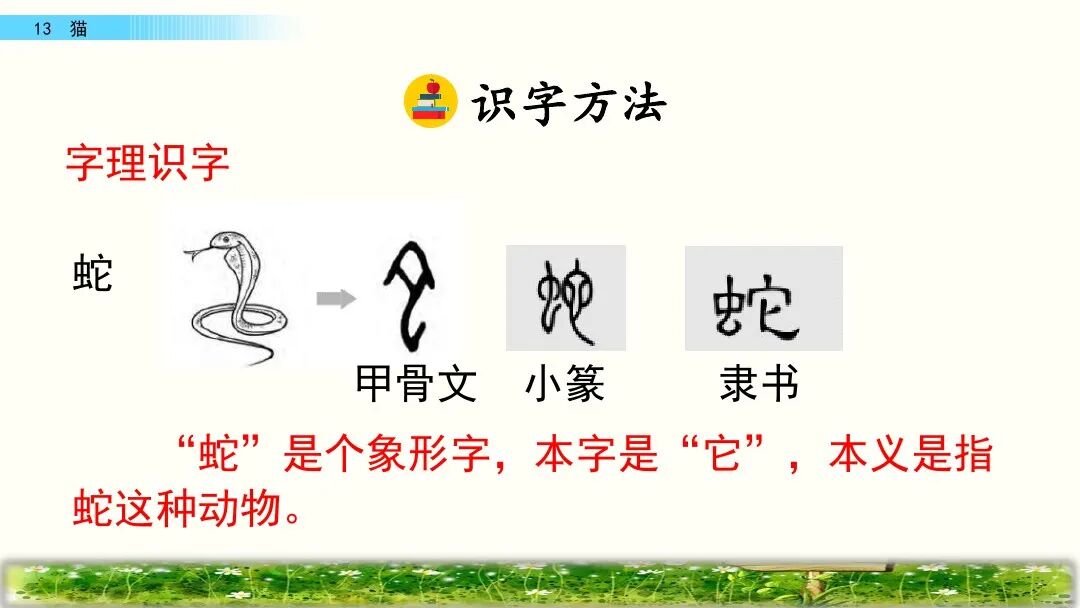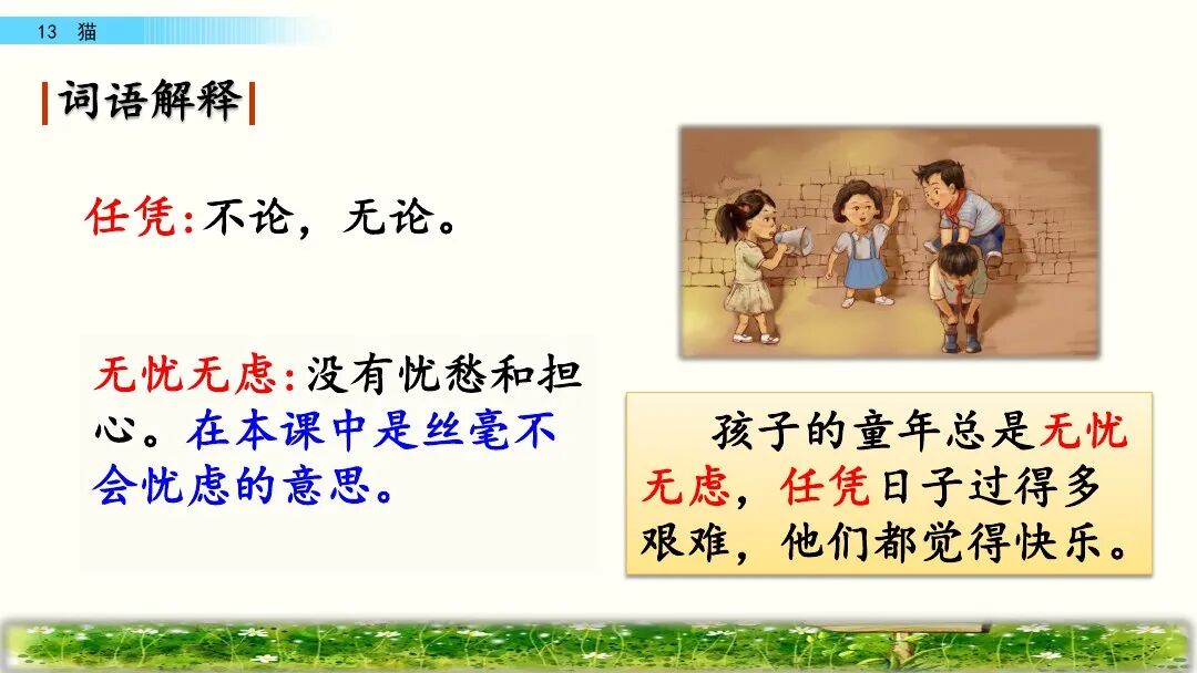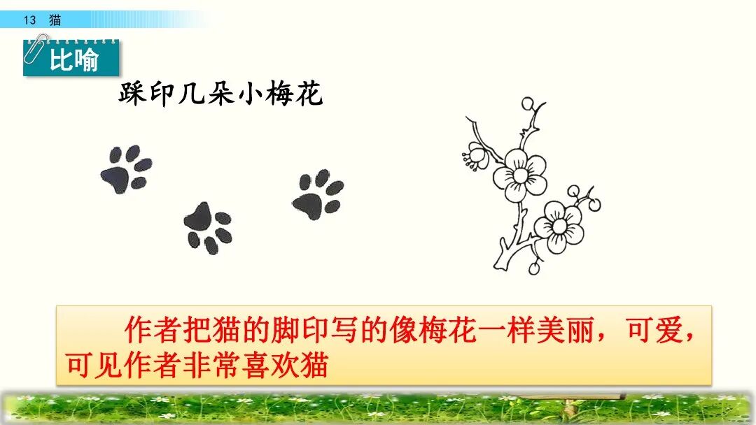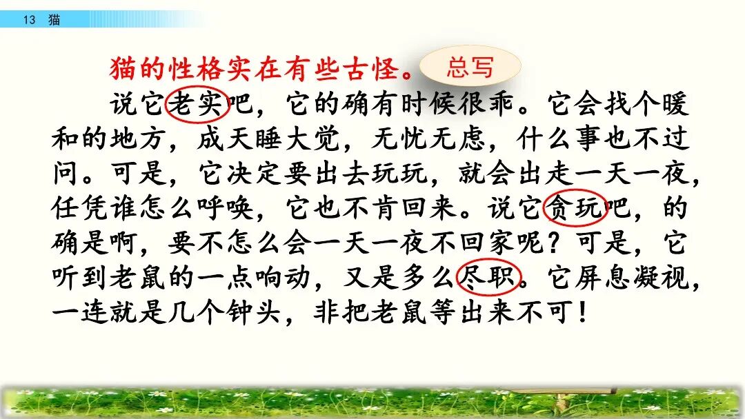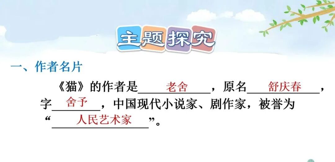 老舍(1899—1966)原名舒庆春,字舍予,满族人,中国现代著名作家,杰出的语言大师,中华人民共和国成立后第一位获得“人民艺术家” 称号的作家。主要作品:《骆驼祥子》 《四世同堂》 《茶馆》等。1.尽职:努力做好本职工作。猫的天职就是捉老鼠,文中写猫在捉老鼠时既警觉又有决心和耐心,所以说它在尽心尽力地做好本职工作。2.古怪:跟一般情况很不相同,使人觉得诧异的;稀奇罕见的。5.丰富多腔:本课指猫的腔调丰富,会各种各样的声音。6.变化多端:变化多样。作家笔下的这只猫的叫声长短不同,粗细各异,富有变化。7.生气勃勃:充满生机与活力。文中意在表现猫的天真可爱、淘气顽皮及作者的喜爱之情。第一部分(1-5):按“总—分—总”式结构介绍猫的古怪性格。“古怪”是指跟一般情况很不相同,或生疏罕见,使人觉得诧异,在本文中是指猫的性格让人难以捉摸。这句话是前三个自然段的中心句,是对猫的性格的集中概括。这句话明贬实褒,表现出作者对猫的喜爱之情。“任凭”是“无论、不管”的意思,这句话用“任凭……也……”这组关联词语,突出了猫的极其贪玩,一玩起来就要玩个痛痛快快。3.它屏息凝视,一连就是几个钟头,非把老鼠等出来不可!“非……不可……”这个双重否定句写出了猫等老鼠的决心和耐心,突出表现了猫的尽职尽责,这与之前的贪玩看似互相矛盾,但都是事实,正好明的性格古怪。4.它还会丰富多腔地叫唤,长短不同,粗细各异,变化多端。“丰富多腔”“长短不同”“粗细各异”“变化多端”表现了猫的叫声变化多样的特点,表达了作者对猫的欣赏与喜爱。4.它若是不高兴啊,无论谁说多少好话,它也一声不出。“无论”用来表示条件不同而结果不变。这句话写出了猫在不高兴时极端冷漠的表现,可以替换为“任凭……也……”。5.小猫满月的时候更可爱,腿脚还不稳,可是已经学会淘气。这是本段中起承上启下作用的过渡句,表明下文将重点写小猫“可爱”“淘气”的特点。2.它要是高兴,能比谁都温柔可亲:用身子蹭你的腿,把脖子伸出来让你给它抓痒,或是在你写作的时候,跳上桌来,在稿纸上踩印几朵小梅花。“蹭”换成“碰”“几朵小梅花”换成“几个小脚印”好不好, 为什么?“蹭”是轻轻的磨擦,蹭出了猫的可爱,蹭出了撒娇,蹭出了温柔,蹭出了高兴蹭出了作者对猫的喜爱。“蹭”表现了猫似乎在撒娇、耍赖,写出了猫与主人的亲昵。一个“印”字反映了主人对猫的万般喜爱。同时采用比喻的修辞方法,把猫踩在稿纸上的爪印比作美丽的“小梅花”,表达了作者对猫的喜爱之情。3.它什么都怕,总想藏起来。可是它又那么勇猛,不要说见着小虫和老鼠,就是遇上蛇也敢斗一斗。这段话里说猫“什么都怕”又说它“勇猛”前后矛盾吗? 为什么?不矛盾。因为这正好揭示了猫古怪的性格。胆小与勇猛同时体现在猫的身上也就不足为奇了。猫小时候十分淘气可爱。 表现在:一是刚满月,腿脚还站不稳时就爱玩。二是玩起来不怕摔跟头,也不怕疼。三是稍大一点,胆子越来越大,也就更加淘气。作者运用具体事例写出了猫的性格特点。写猫老实时,列举猫“成天睡大觉、无忧无虑、什么事也不过问”的事例。写猫贪玩时,列举猫一天一夜不回家的事例、写猫尽职时,列举了猫“一连就是几个钟头”蹲守“非把老鼠等出来不可”的事例,都具体表现了猫古怪的性格。写猫小时候淘气可爱,列举了它玩鸡毛、玩线团、摔跤、打秋千等具体事例来表现。本文生动地描述了猫的古怪性格和小猫满月时的淘气可爱的特点,表达了作者对猫的喜爱之情。十四、教材课后习题