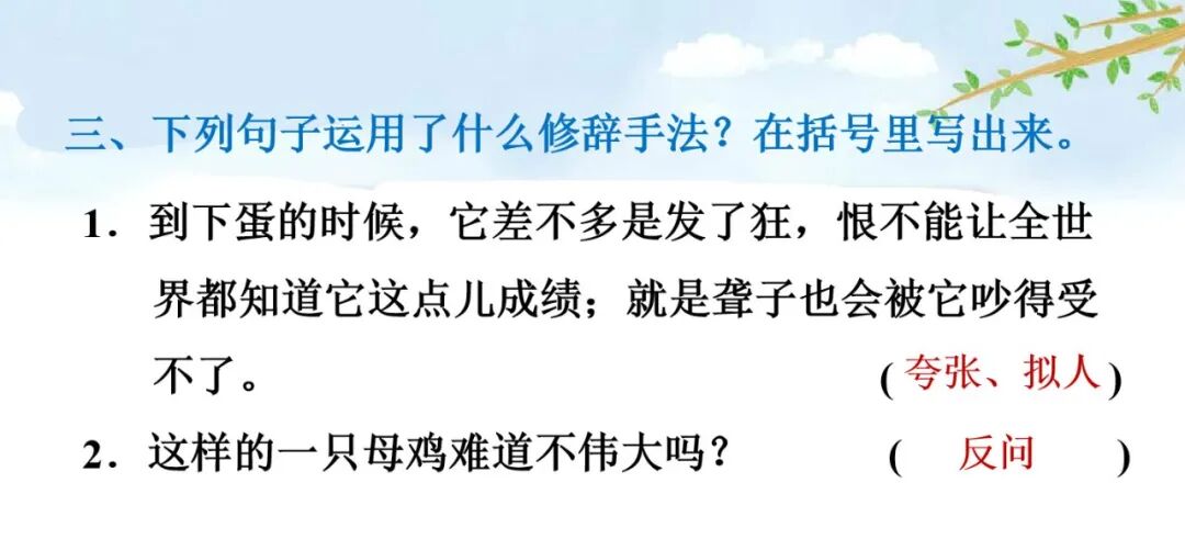 1.“到下蛋的时候,它差不多是( ),恨不能让( )知道它这点儿( );就是聋子也会被它( )。”这句话运用了( )的写法,表达了作者对母鸡的( )。