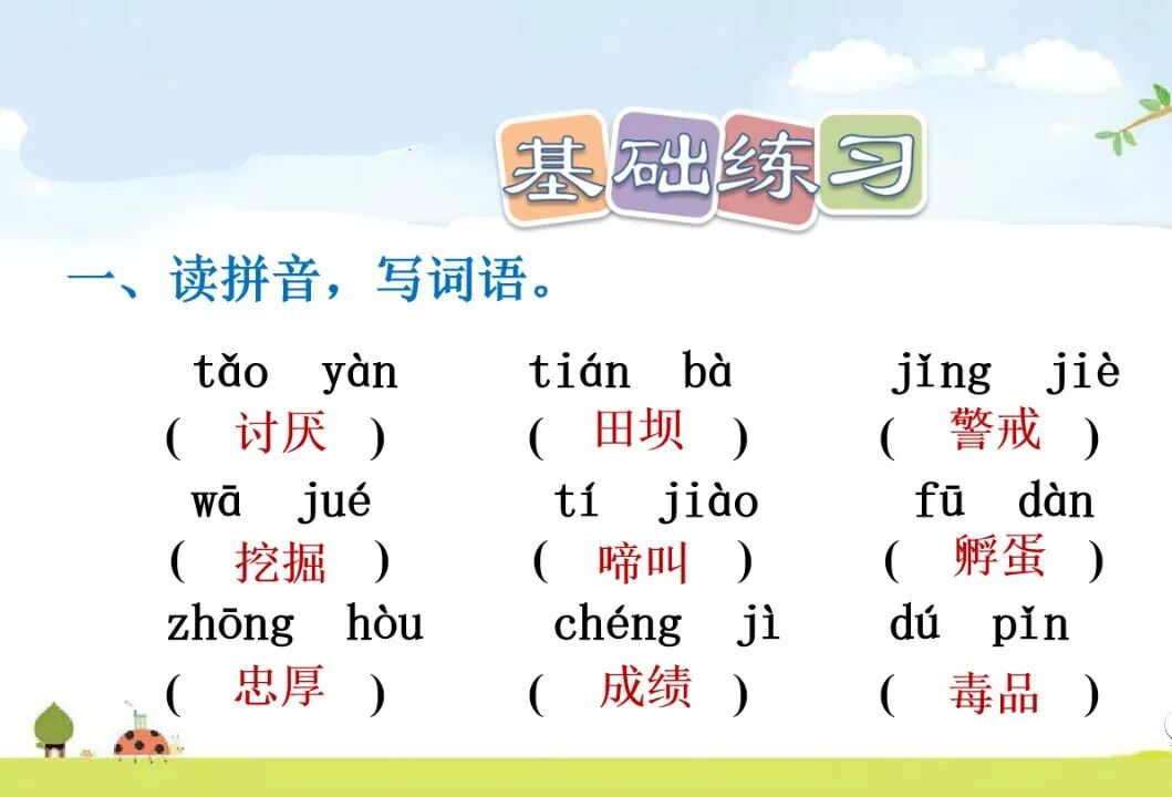 九、1.偶然 敏锐 感激 2.(1)如果……就…… (2)因为……所以…… 3.C十、我最讨厌狗了,我讨厌它的叫声,讨厌它身上的毛,讨厌......总之讨厌它的一切。所以我家的狗虽然每次见我都跑出老远迎接我,还对我摇尾巴表示友好,但是我从来不理它,更不要说喂它食,有时心情不好还会拿它撒气。但是有一天晚上我正睡的香,它突然大叫起来,把我惊醒了,我愤怒的拿了一条棍子冲出门。举起棍子刚要打,却发现一个贼拼命躲闪着,我家的狗却对着那个贼猛扑,虽然贼手里拿着刀,把狗砍得浑身是血,狗依然毫不退缩。原来这个贼白天相中了我最喜欢的一窝小兔。看到这个情景我的心里一阵难受,眼睛酸酸的。我讨厌的狗对我家是多么忠实啊!多么值得我喜欢啊!