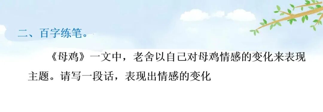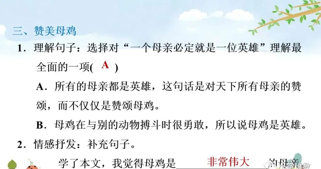 2.作者为母鸡身上所表现出的母爱所震撼,认识到天地间所有的母亲都是英雄。这是对普天下所有母亲的赞颂。