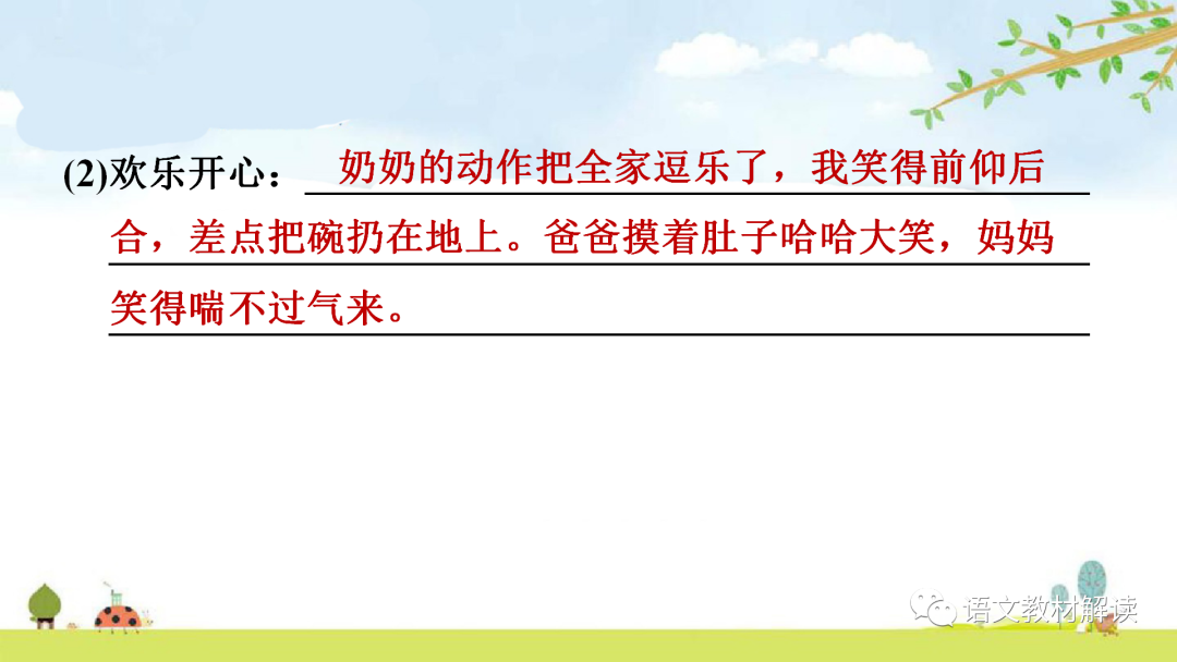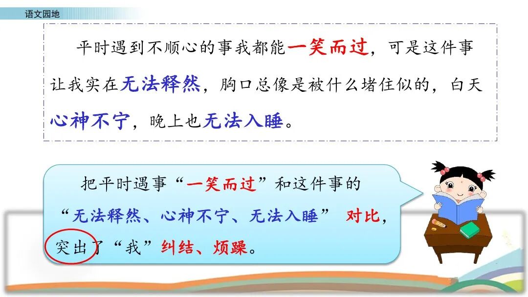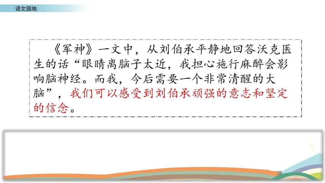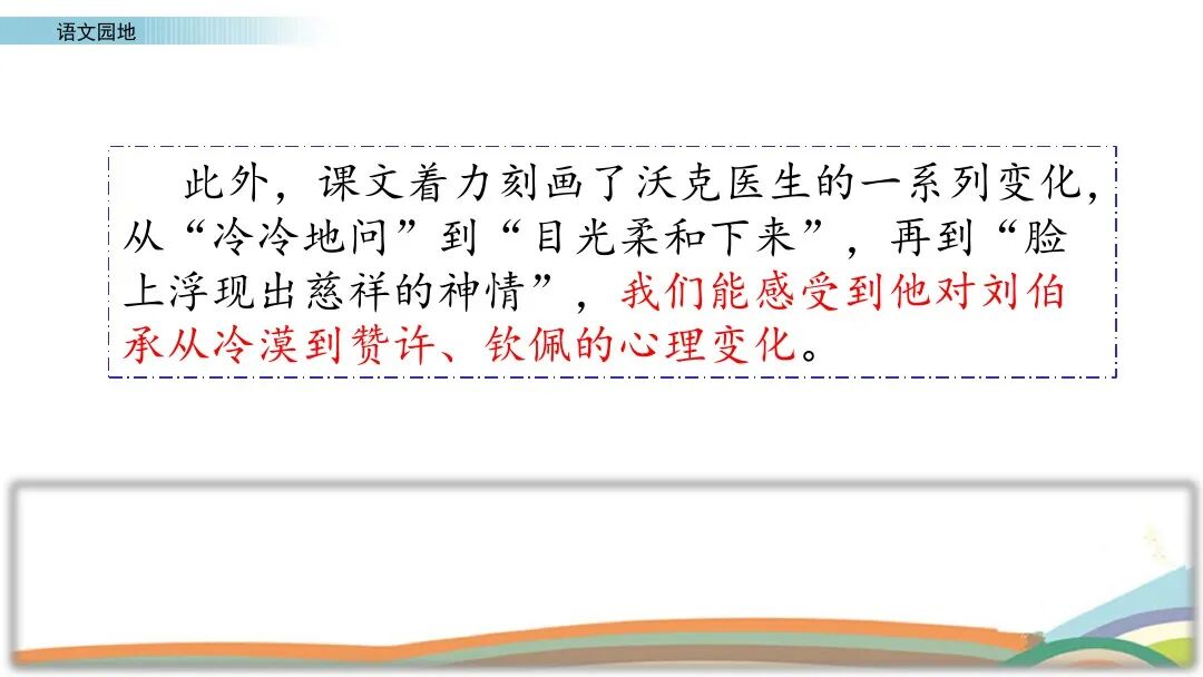 (2)从见到这封电报起,毛泽东整整一天没说一句话,只是一支接着一支地吸着烟。(3)他们用怀疑而又惊异的目光,对我自上而下地望了几遍,就同声命令说:“走吧!”(1)第一句主要抓住沃克医生的神态描写体会,由“惊疑”一词可以体会到沃克医生内心的惊讶和怀疑。(2)第二句主要抓住毛泽东的动作描写体会,“整整一天没说一句话”“一支接着一支地吸着烟”表现了毛泽东内心的无比痛苦。(3)第三句通过国民党士兵的神态和动作描写体会,“怀疑而又惊异的目光”“自上而下地望了几遍”表明他们对“我”作为共产党的领导,身上竟然搜不出一个铜板十分怀疑,内心觉得不可思议。例句:妈妈在公交牌下站着,一会儿翘首远望,看看车来了没有,一会儿双手背后,原地转来转去。看得我都有些头晕了。2.下面的句子写出了人物与平时不同的表现,体会它们的表达效果,照样子说句子。(1)手术台上,一向从容镇定的沃克医生,这次双手却有些颤抖,他额上汗珠滚滚,护士帮他擦了一次又一次。(2)平时遇到不顺心的事我都能一笑而过,可是这件事让我实在无法释然,胸口总像是被什么堵住了似的,白天心神不宁,晚上也无法入睡。(1)在第一句中,沃克医生在往常的手术中是镇定从容,而这一次的表现体现出这不是一次普通的手术。这样的手术,在医生看来,病人是无法忍受的,所以沃克医生异常紧张。(2)第二句通过“我”面对不顺心事的不同表现,“一笑而过”与“‘心神不宁’、‘无法入睡’”的前后对比,体现出事情的糟糕,令人烦恼,“我”无法释怀。例句:考场上,一向轻松淡定应考的小明,这次却心里有些忐忑,手心不断出汗,用纸巾一遍又一遍地擦拭。![]()