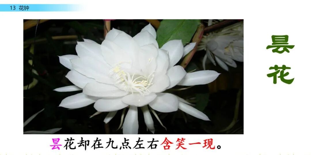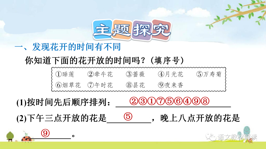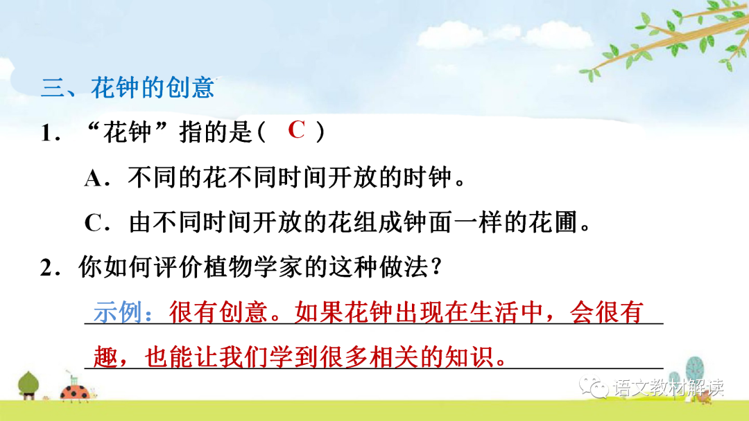 争奇斗艳:竞相展示形貌、色彩的奇异、艳丽,以比高下。湿度:空气内含水分的多少,分为绝对湿度、相对湿度等。吻合:完全符合。本文是讲有的植物开花的时间与昆虫活动的时间一致,完全符合。1.不同的植物为什么开花的时间不同呢?有的植物开花的时间,与温度、湿度、光照有着密切的关系。运用设问的修辞方法,引发读者思考;同时也是个过渡句,在文章中起承上启下的作用。2.一位植物学家曾有意把不同时间开放的花种在一起,把花圃修建得像钟面一样,组成花的“时钟”。这句话点明了“花钟”的含义,照应题目,使文章中心突出。3.这些花在二十四小时内依次开放。你只要看看什么花刚刚开放,就知道大致是几点钟,这是不是很有趣?“大致”看似表意模糊,其实作者使用这个词语恰恰是一种准确的表达,是对客观事物真实状况的准确反映。无论开花时间,还是对原因的分析,都是有一定范围,受一定条件限制的,如果把话说死了,看似肯定,反而不科学了。这句话写出了花钟的作用,点明了花钟的趣味性。1.昙花却在九点左右含笑一现……第一自然段末尾的省略号省略了什么内容?按照时间的先后顺序列举了九种花开放的时间,充分说明了作者的发现——不同的花开放的时间是不同的。作者运用拟人的修辞方法,生动形象地写出了各种花开放时的动态画面,多样的句式使课文显得生动有趣,不单调。省略号省略的内容是生活中还有很多很多的花在不同的时间开放。2.不同的植物为什么开花的时间不同呢?有的,植物开花的时间,与温度、湿度、光照有着密切的关系。“不同的植物为什么开花的时间不同呢?”这句话有什么作用?运用设问的修辞方法,引发读者思考;同时也是个过渡句,在文章中起承上启下的作用。3.读了第二自然段,想想昙花为什么会在九点左右含笑一现?用自己的话说一说。以昙花为例说明植物开花的时间受温度、湿度、光照限制。县花的花瓣娇嫩,白天光照太强,深夜气温过低,它适应了晚上九点左右的温度和湿度,所以它在温度、湿度、光照的限制下只能九点左右含笑一现。这段话还运用拟人的修辞方法表现了县花的美丽。4.课文中运用了哪些技法描写九种花的开放?作用是什么?拟人的修辞方法和多样的句式。运用拟人的修辞方法使各种花开放的动态画面生动具体;多样的句式使课文的语言生动有趣,不单调。