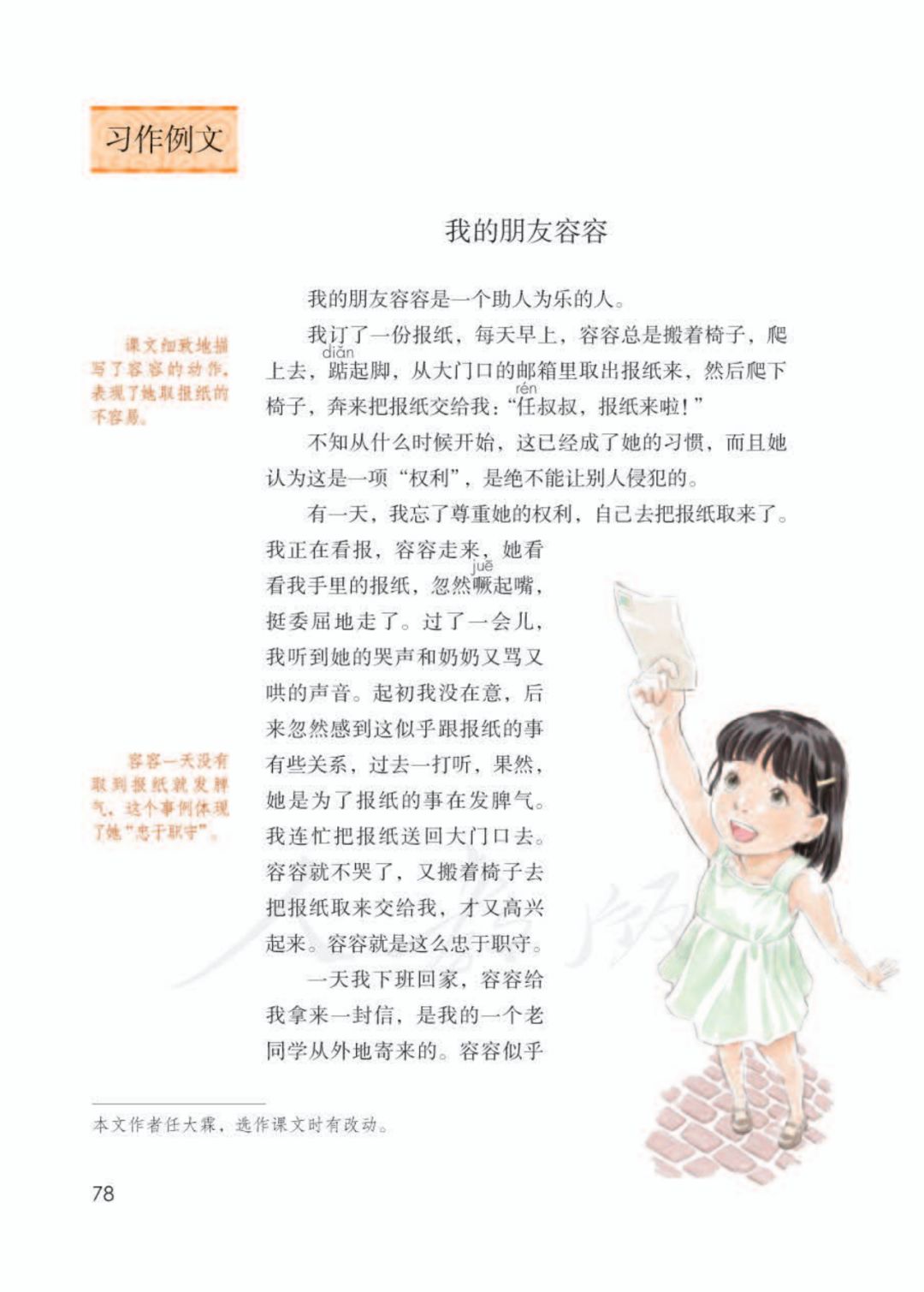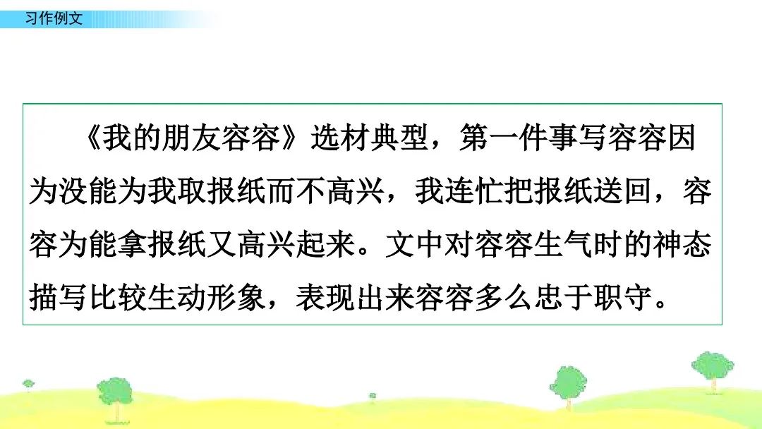 作者通过“取报纸”“寄信”两个典型事例,写出我的朋友容容的特点。在事件的描述中,作者抓住了容容的动作、语言、神态,细致刻画了容容忠于职守、助人为乐、天真可爱的形象,给读者留下了深刻的印象。
