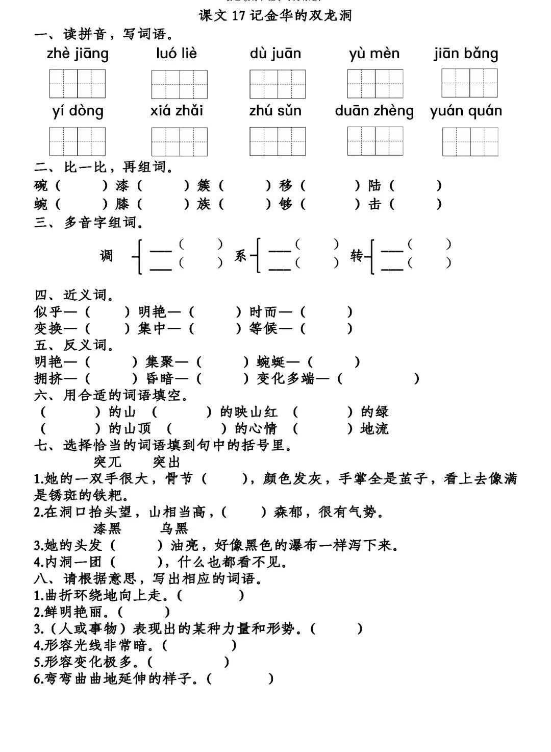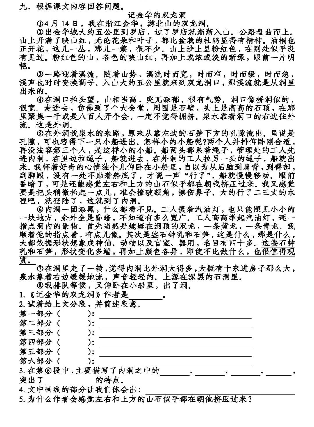 3.在第⑥段中,主要描写了内洞之中的黄龙、青龙、石钟乳、石笋,突出了内洞昏暗的特点。