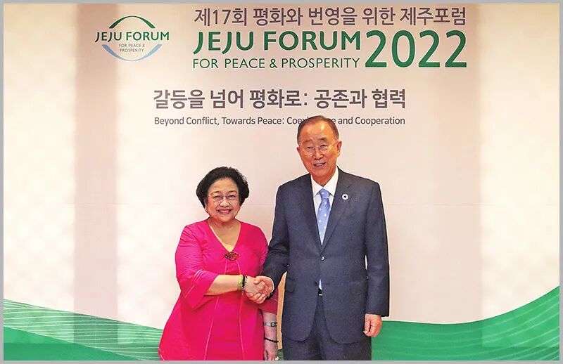 9月15日,我国第五任总统梅加瓦蒂在韩国济州岛成为2022年济州和平论坛主讲人。图为梅加瓦蒂与前任联合国秘书长潘基文握手致意的镜头。