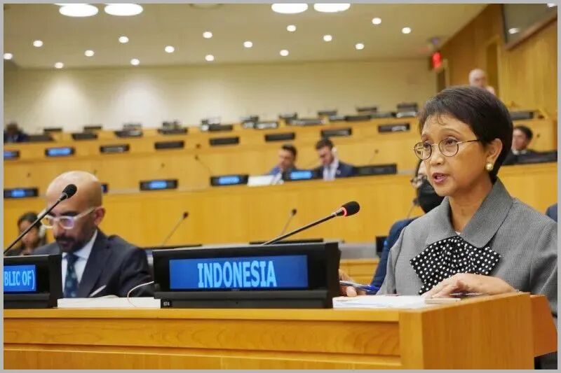 图:9月21日,印尼外交部长蕾特诺在不结盟运动大会发言