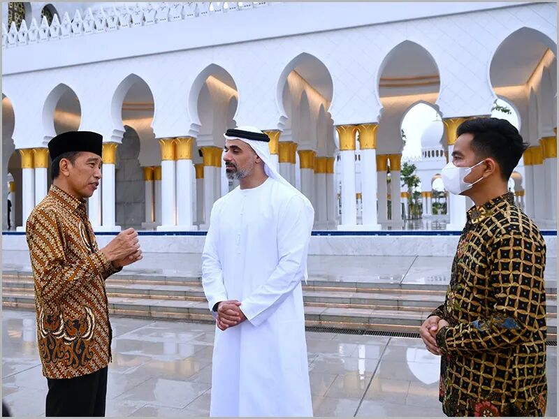 12月11日,佐科维总统在中爪哇省梭罗市接见阿联酋总统之子Khalidbin Mohamedbin Zayed Al Nahyan(中)。佐科维总统大儿子、梭罗市长吉布兰陪同接见。