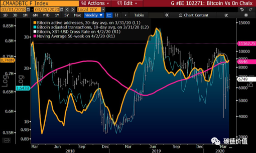 新冠病毒疫情反而“刺激”比特币链上指标向好。比特币链上指标的较好表现为价格上涨提供了有力支撑,其中新冠病毒疫情“刺激”了比特币在整个加密货币市场中的表现,当前比特币已使用地址和调整后交易量等指标都表明比特币已经打好了牢固的基础。我们认为,五月份到来的比特币区块奖励减半也会成为比特币价格上涨的另一个动力。 比特币减产 vs. 链上指标。比特币供应量减少 vs. 主要链上指标。 4月2日,比特币价格大约为6,600美元,但此时的30天平均活跃地址数量却与比特币在9,000美元价位时的数量接近。我们发现10天平均交易价格是更可靠的价格指标,比特币有限的公有链,以及越来越多的采用,都是关键的价格决定因素。 比特币地址数量的增加支持了比特币向“数字黄金”过渡这一观点。 交易量和地址都呈现出上升趋势