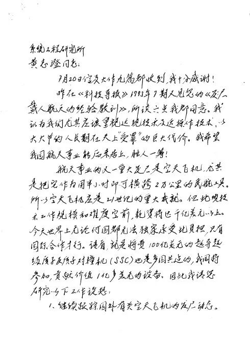 昨在《科技导报》1993年7期又见您的《发展载人航天的经验教训》,所谈六点我都同意。我认为人们尤其应该重视遥现技术和遥操作技术,以大大节约人长期在天上“受罪”的巨大代价。我希望我国的航天事业能后来居上,胜人一筹!