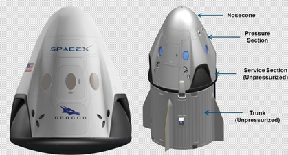 “载人龙”飞船采用两舱式设计,它具有可重复使用、乘员运输能力强、内部空间大和操作友好等特点,能够执行低成本、商业化的低地球轨道载人航天飞行任务。飞船可容纳7名航天员(目前俄罗斯“联盟”飞船只能搭载3人)。飞船净重9.525吨,发射质量15吨,高8.1米,直径4米,加压容积10立方米,非加压容积37立方米,上行载荷能力6000千克,下行载荷能力3000千克,可处理废弃物800千克。该飞船可独立飞行工作7天,在对接状态下能工作210天。