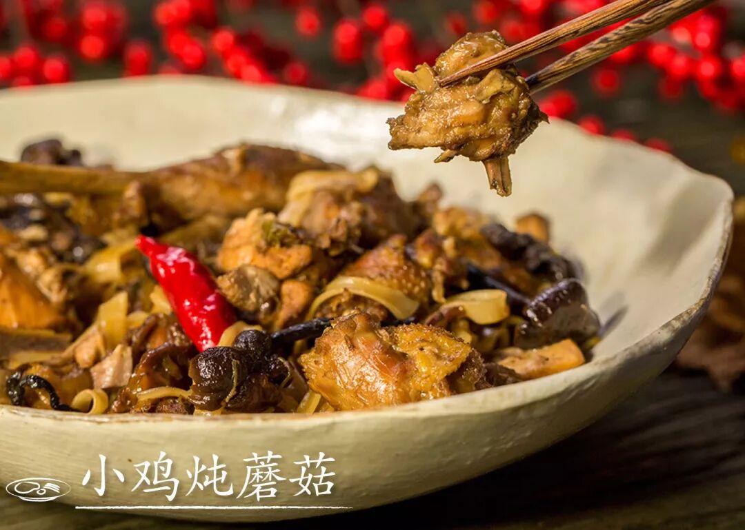 小鸡炖蘑菇是东北名菜,蘑菇选用野生榛蘑最佳,和土鸡块、粉条一同炖煮,鲜香味浓。