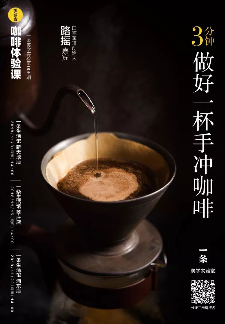 本周四开始我们还将在上海一条实体店陆续推出美食体验课,第一期我们邀请了白鲸咖啡创始人路摇,手把手教大家做手冲咖啡,长按上方海报二维码识别,或点击阅读原文,即可免费报名!