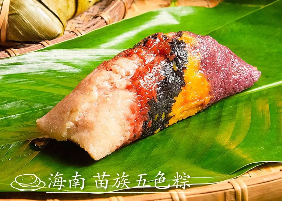 琼中苗寨人家喜食一种奇特的粽子,整个粽身有白、黄、紫、黑、红五种颜色,叫做五色棕,是中国粽子中非常独特的一支。