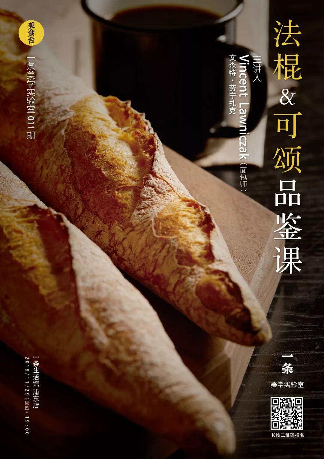 11月29日(周四),我们将在上海一条生活馆的浦东店推出美食体验课的第3期,本次邀请到乐逢法国厨艺学院的欧包教学主厨Vincent Lawniczak(文森特·劳宁扎克),来教大家品鉴何谓优质的法棍和可颂。除了满满的知识干货,现场还能免费品尝到这两款面包,以及学习如何制作快手美味的三明治。