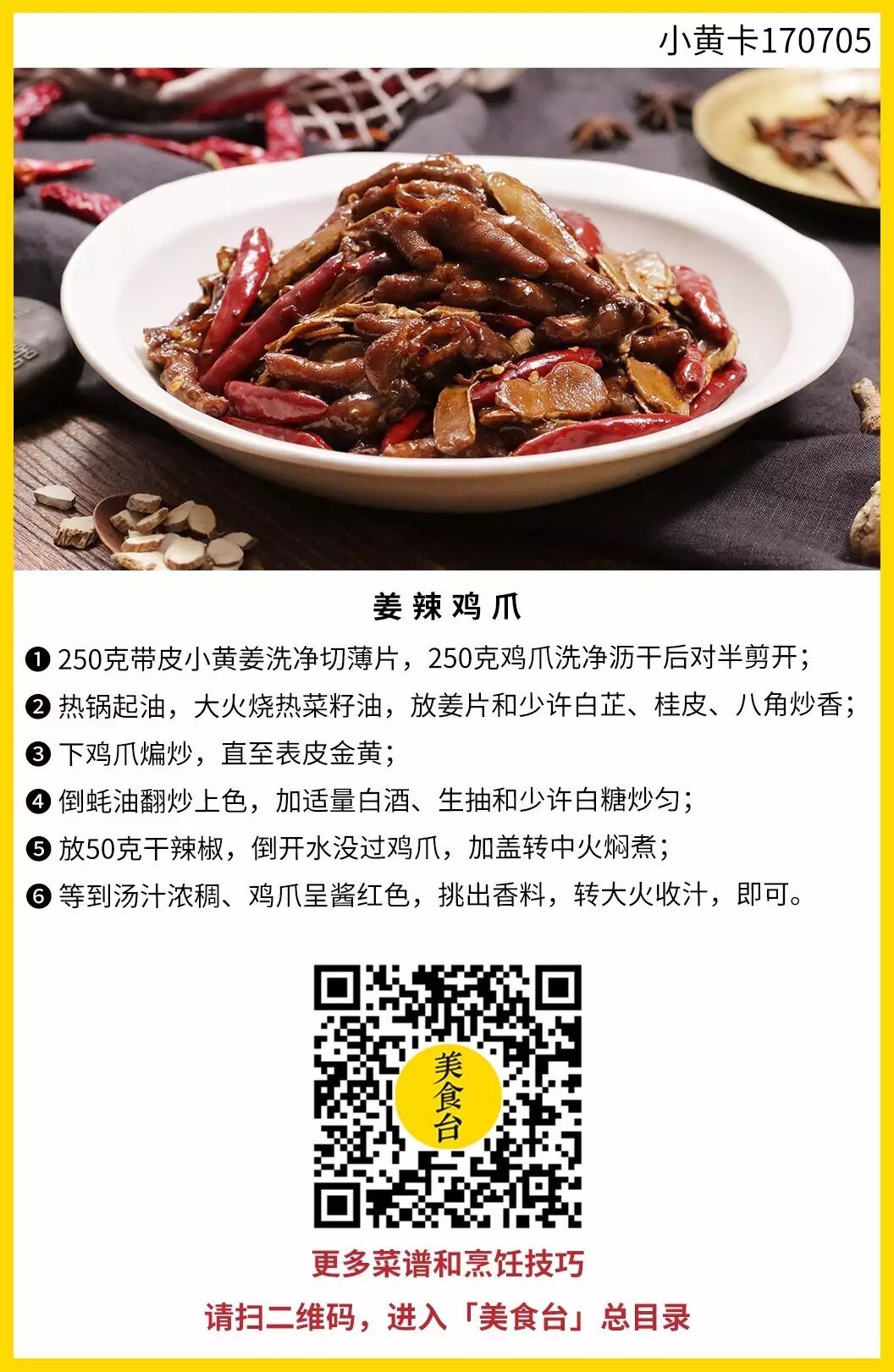 鸡爪是很受欢迎的下酒菜,川式泡椒腌、粤式豉汁蒸、泰式酸辣凉拌……吃法特别多!今天推荐一种充满湖南风味的姜辣卤,用到小黄姜、干辣椒与香料,先炒后焖,卤到酥软入味。辛香爽辣的鸡爪,配上冰爽的小啤酒,特别过瘾。【你最喜欢什么下酒菜?欢迎分享】