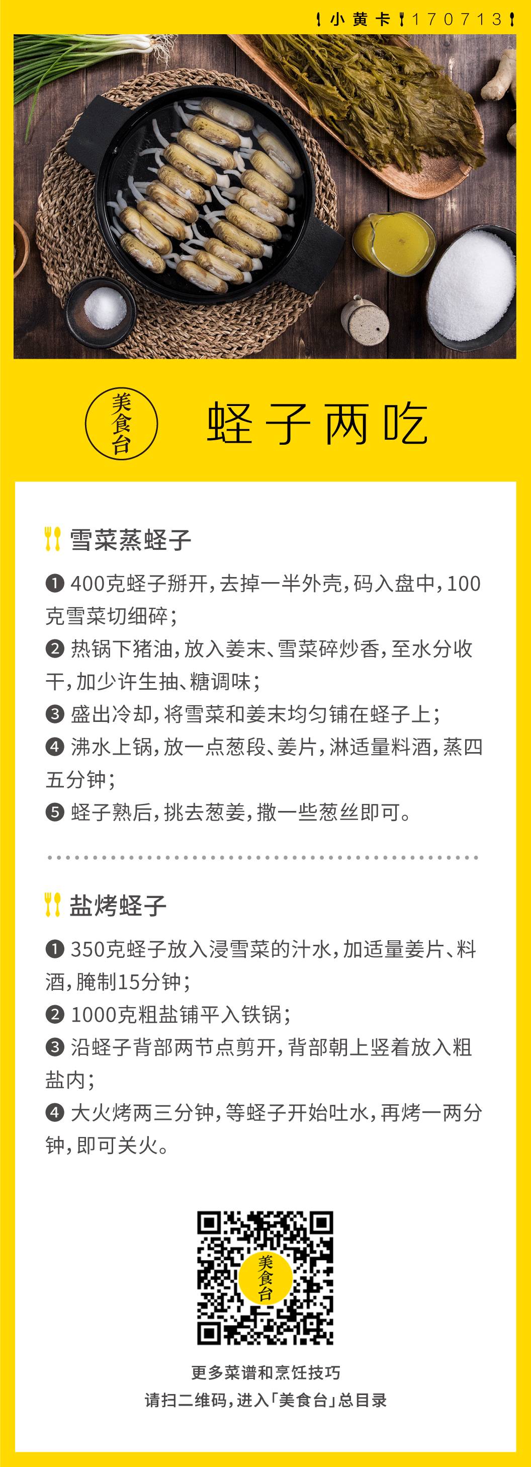 六七月间,正是蛏子肥美的时节。今天教你的两道快手蛏子菜,巧用雪菜做配料,一种将剁碎的雪菜炒香再一同蒸制,另一种则用雪菜汁腌制后粗盐焗烤,两者都保留了蛏子本味,鲜甜肥嫩,下酒下饭一流。【你还喜欢怎么吃蛏子?欢迎分享】