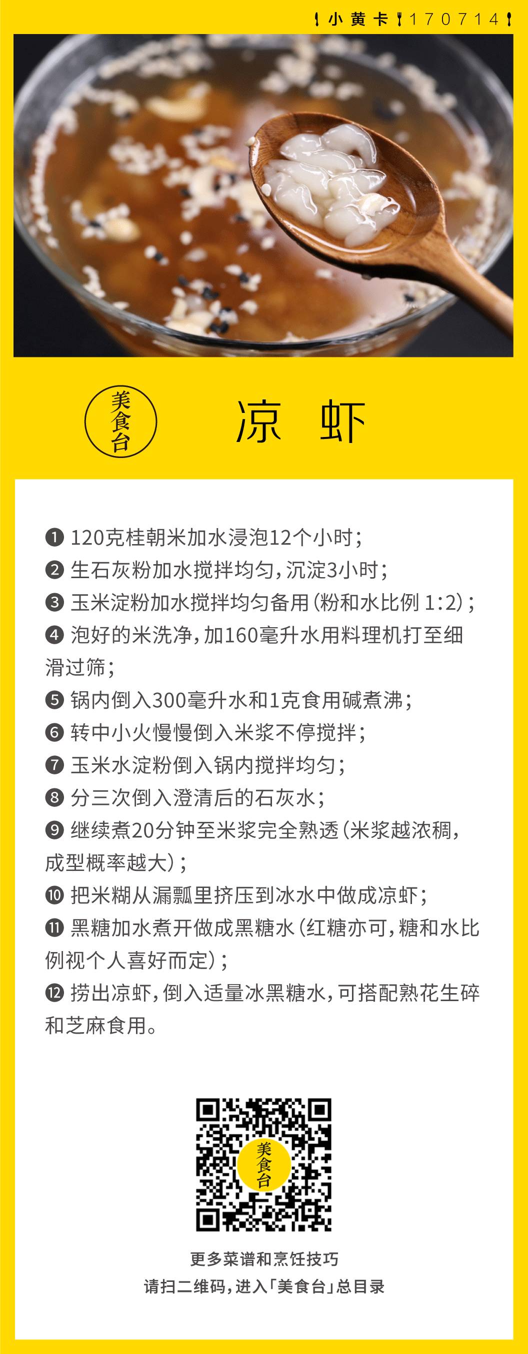 一入伏就酷暑难耐,推荐大家吃一种非常消暑的小吃——凉虾。第一次吃的人往往会问上一句“虾呢?”,其实它跟虾并没有什么关系,只是头大尾细比较像虾米而已,这也主要源自它特殊的制作过程——将大米制成米浆煮熟,再用漏勺挤压到冰水中。吃的时候配红糖冰水,滑软甜糯,沁凉清爽!【你还喜欢什么消暑美食?欢迎分享】