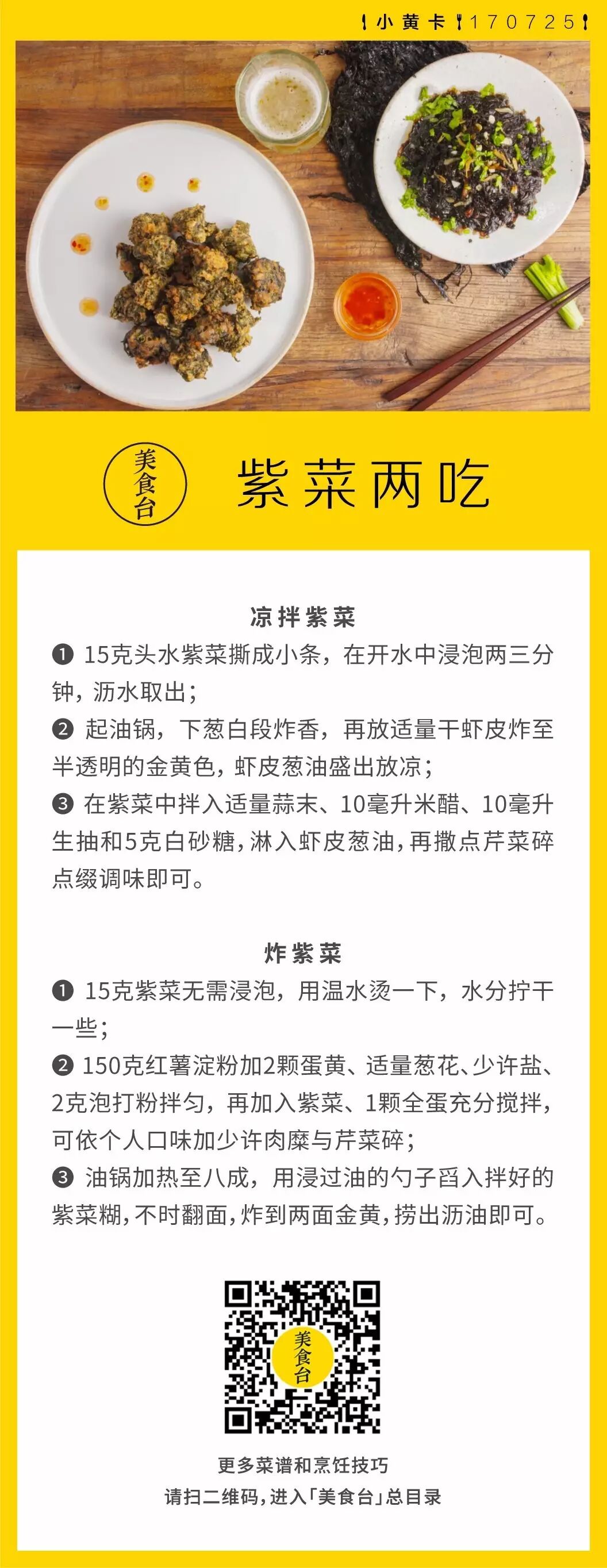紫菜作为一种海产品,吃法相对简单,主要用于烧汤或做配菜,在福建著名的紫菜产地霞浦,凉拌和油炸也是当地夏季很常见的吃法。紫菜稍微泡一泡,用虾米葱油来拌一拌,鲜香十足,开胃下饭;炸紫菜因加入了鸡蛋和红薯淀粉,酥脆却不腻,加入芹菜碎和肉糜,味道更胜一筹。