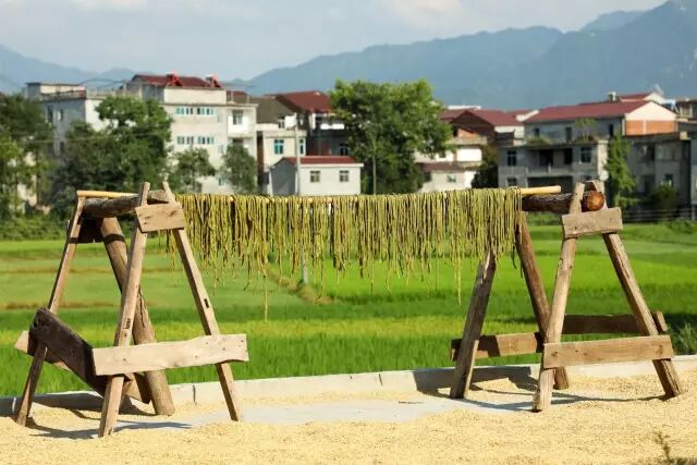 这时节大别山里晒得最多的就是豇豆,新鲜豇豆煮至断生,挂起来晒干,来年用干豇豆烧肉炖汤,又是另一番风味。