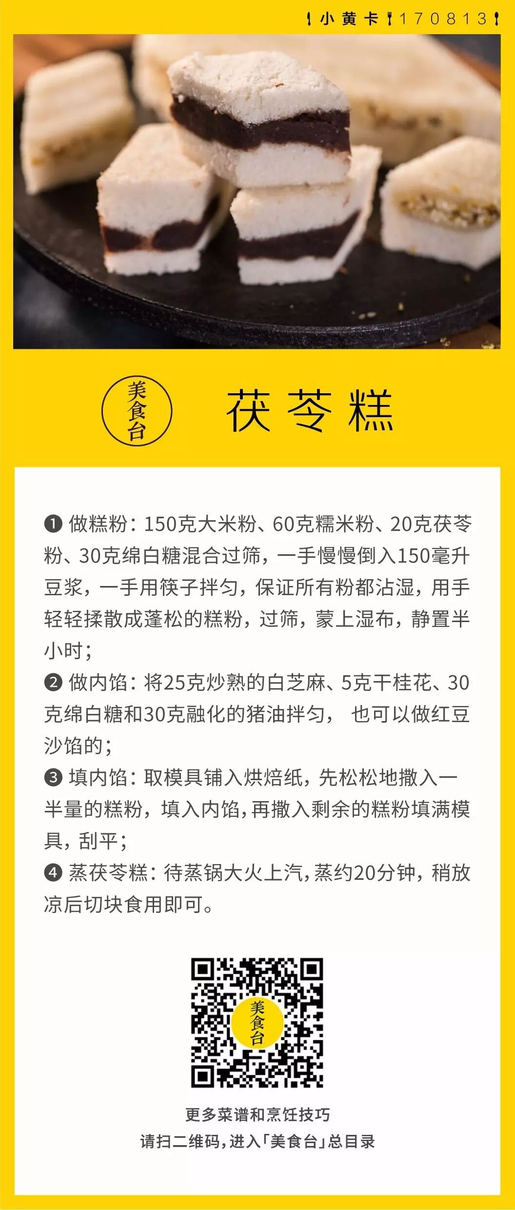 茯苓糕是一款传统甜品,其中的白茯苓健脾祛湿,是夏季滋补良方。如果用热牛奶或热豆浆潮化大米粉,能够增添风味,还可以加入莲子粉、山药粉和芡实粉,口感好,功效丰富。夏季米制品容易发酸变质,因此建议大家最好现做现吃,吃不完的需冷冻保存,再吃的时候回锅加热即可。【你还喜欢哪些传统滋补糕点?欢迎分享】