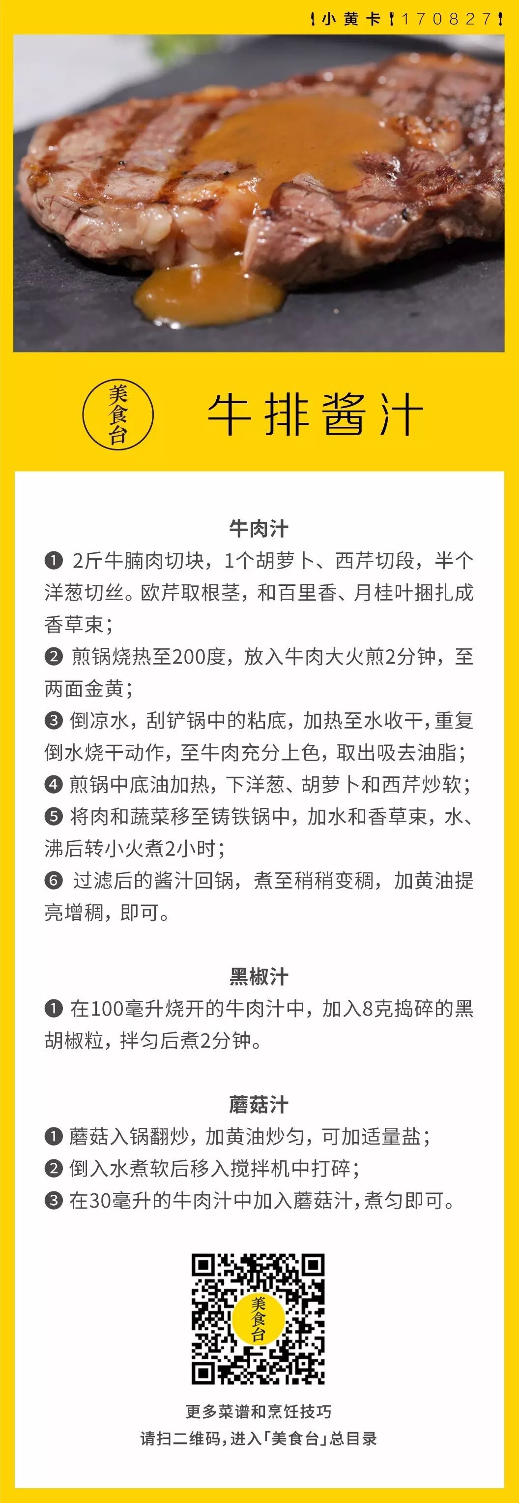 煎牛排非常简单易做,撒点盐和黑胡椒就很美味。如果想要口味更加丰富多变,可以搭配不同的酱汁,吃得更洋气!用牛肉自身的精华,和蔬菜、香料熬制出牛肉酱汁。还可以在此基础上做黑椒汁和蘑菇汁,香浓美味,让你的牛排风味更上一层楼!【你最喜欢什么样的酱汁?欢迎分享】
