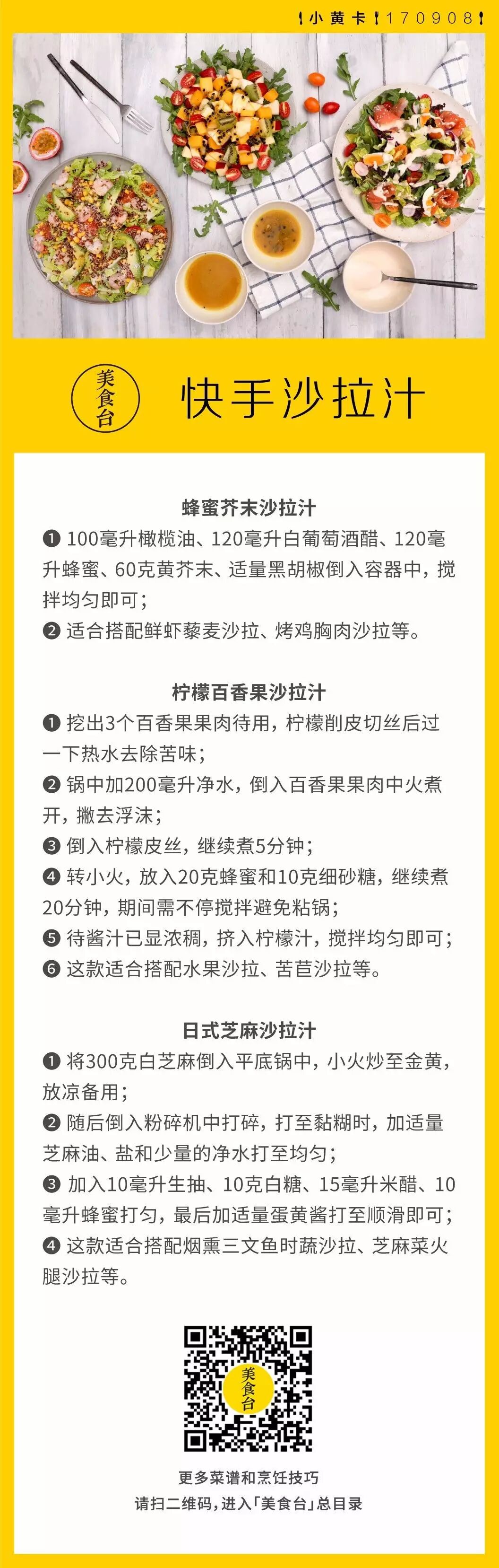 沙拉是现在很受欢迎的健康料理,今天教你三款沙拉汁,让简简单单的沙拉口味更丰富。蜂蜜芥末沙拉汁,带有一丝辛辣,搭配海鲜类或者烤鸡胸肉沙拉会十分开胃,而酸甜的柠檬百香果沙拉适合水果类的沙拉,香气馥郁,最后一款芝麻沙拉汁,酸酸咸咸,可以让口味略重的烟熏三文鱼、火腿沙拉更加诱人哦。【你最爱的沙拉搭配是什么?欢迎分享】