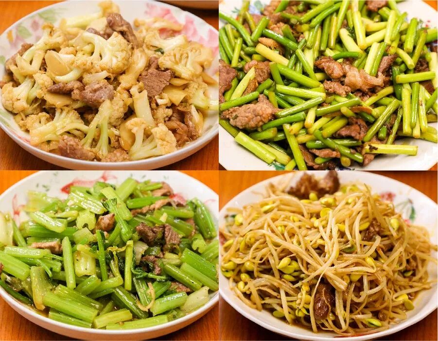 上好的前腿肉简单配几个蔬菜炒成肉片,就是丰富的配菜。花菜、蒜薹、芹菜、豆芽,这在冬天蔬菜不多的北方,已经很丰盛了。这些菜炒法简单,热锅热油猛火爆炒,调味基本都一样,都是辣椒、大蒜、花椒面、盐等调味,胜在肉好,风味上佳。