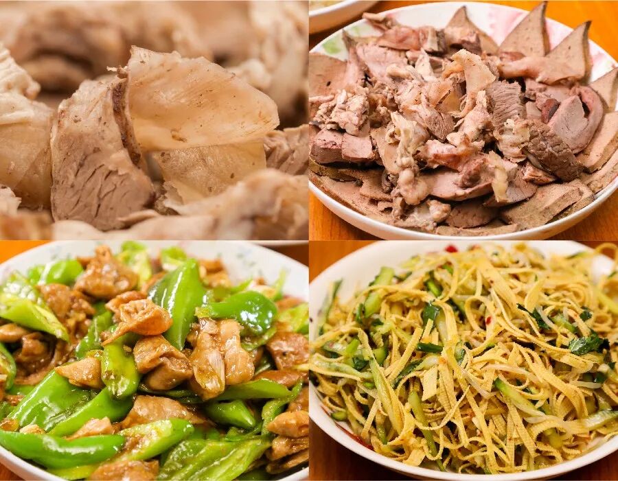 (从上往下,从左至右)炖肘子、猪肝猪心拼护心肉、辣椒熘肠肚、黄瓜豆芽拌豆腐皮