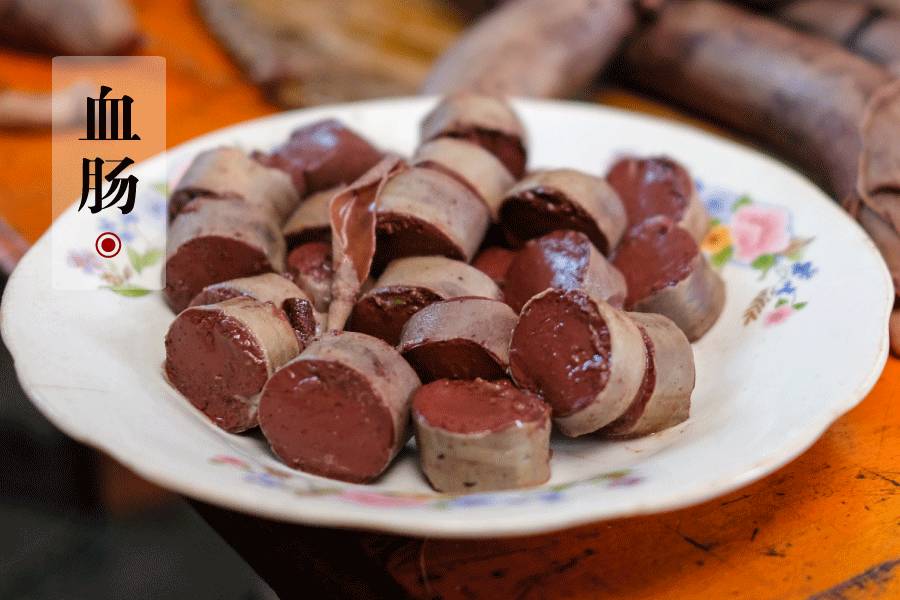 血肠是杀猪菜中的精华,用现接的猪血,加棒子骨烀的老汤兑匀,下姜蓉、葱蓉、花椒面、盐巴等调味,灌入小肠而成。血肠煮好后切块,趁热吃最美味。冷掉的话,就会倒入老汤锅里烀热一下再吃。