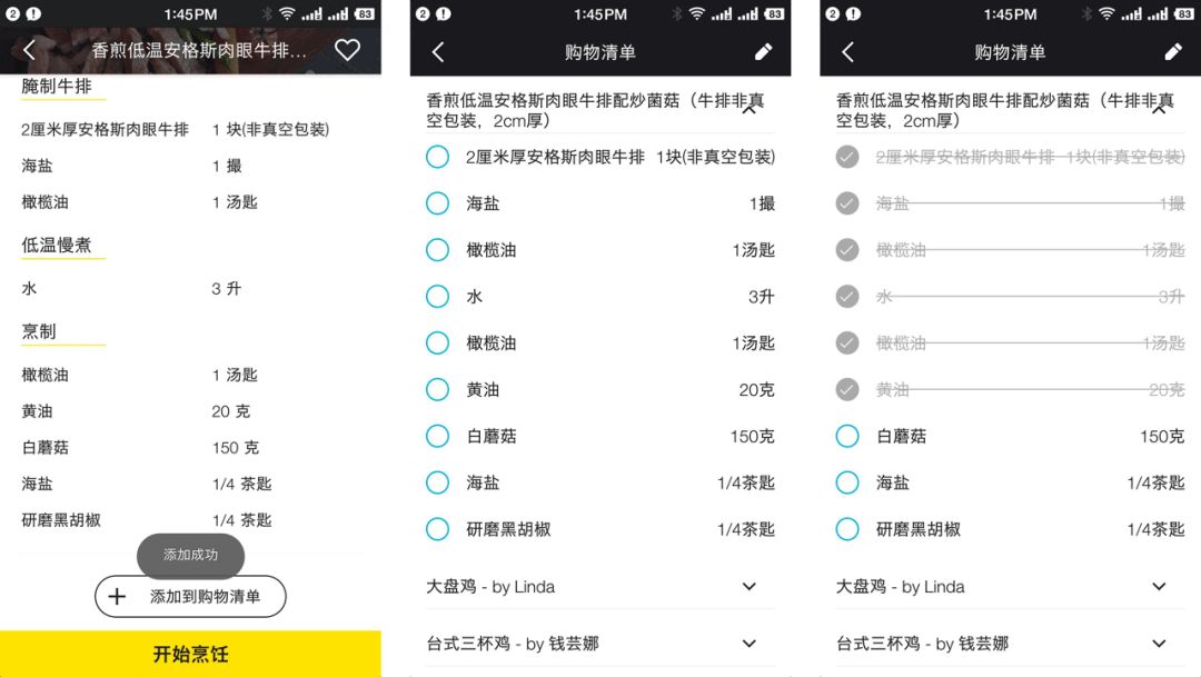 比如,APP内的购物清单功能,在每道食谱开头都会列出详细的食材清单。