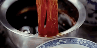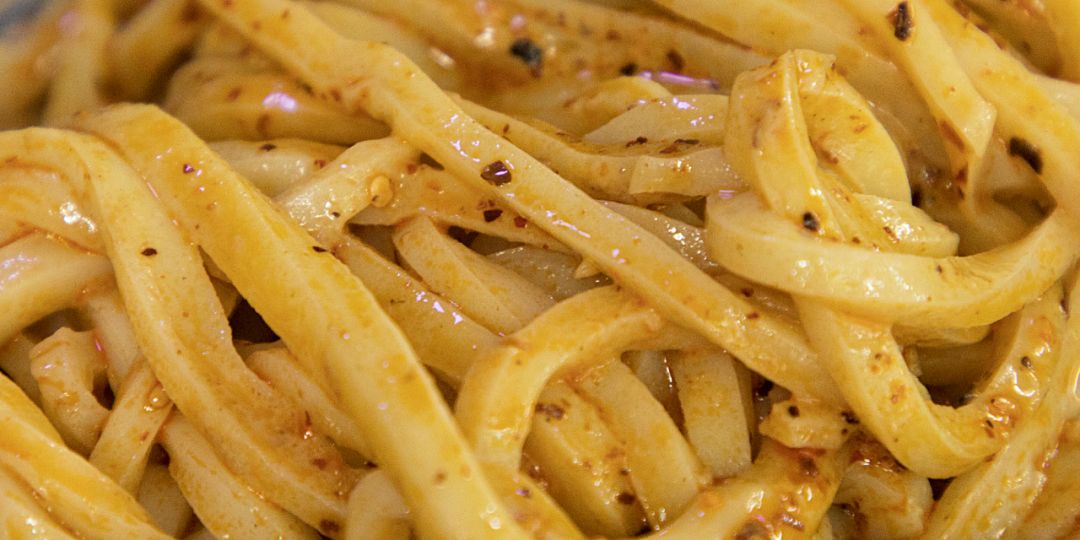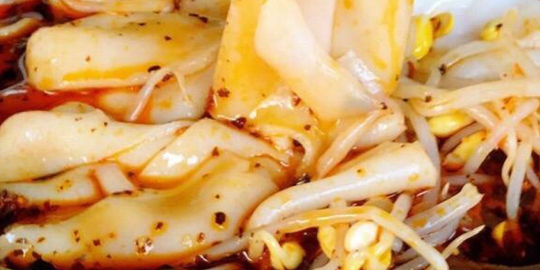 一米长的大刀把白嫩的皮子切成细条,揪一撮在辣椒油里豪爽一甩,红光诱人。香料水和醋水隐约散发着香气,猛吸一口,撩得过瘾。