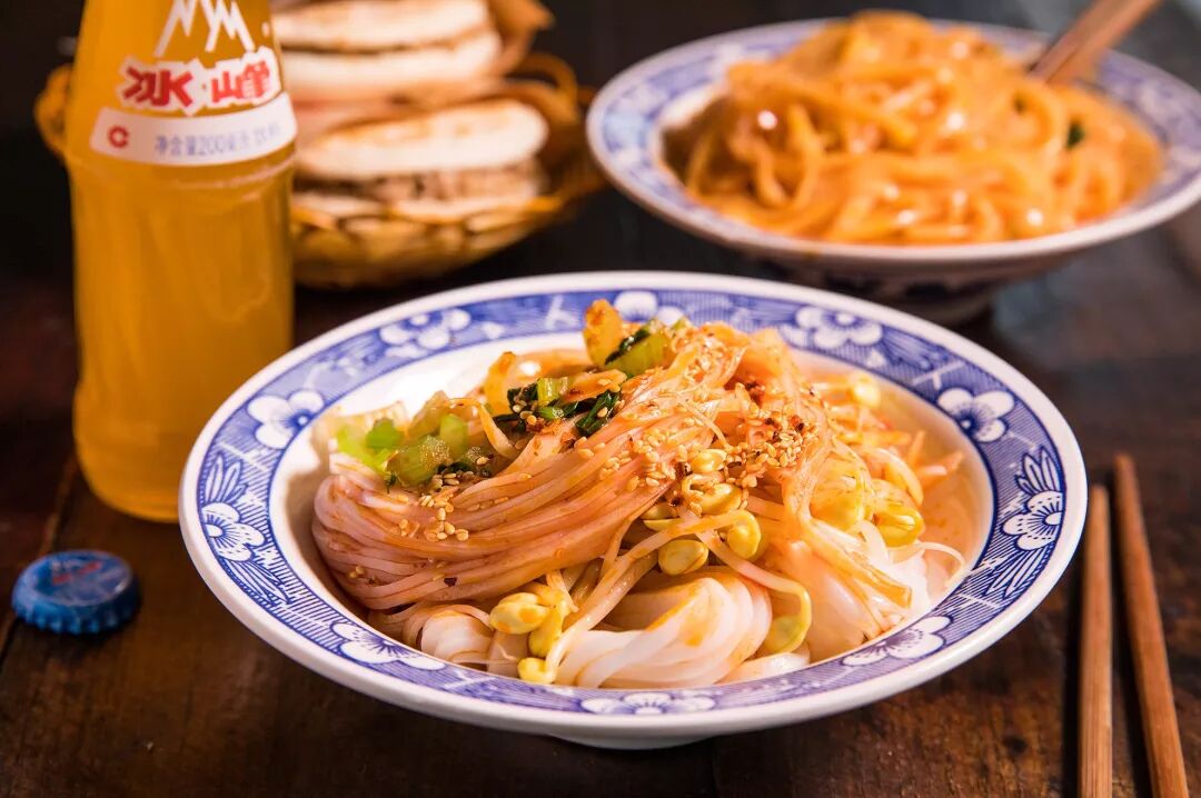 吃米皮当然要配上肉夹馍和稀饭,冷藏冰峰是夏日最受欢迎的百搭饮品,秦镇当地人还有喝黄酒吃米皮的习惯。