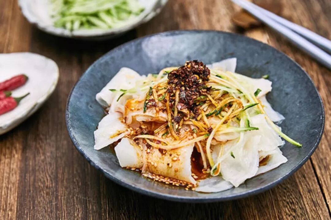 西安当地回族人喜欢的是一碗口味酸辣,芝麻酱浓厚的麻酱酿皮。这种面皮制作方法最简单,只需调和面浆,上锅蒸熟即可。不洗的面最大程度上保留了麦香味,口感也更加柔软。
