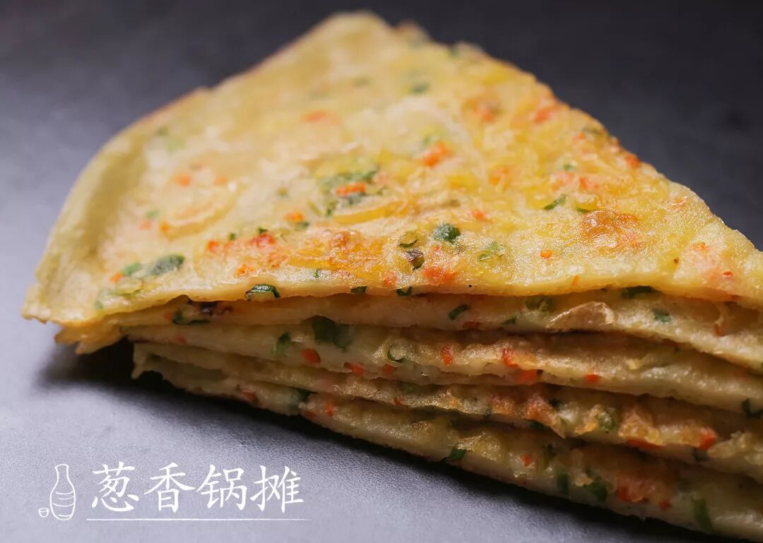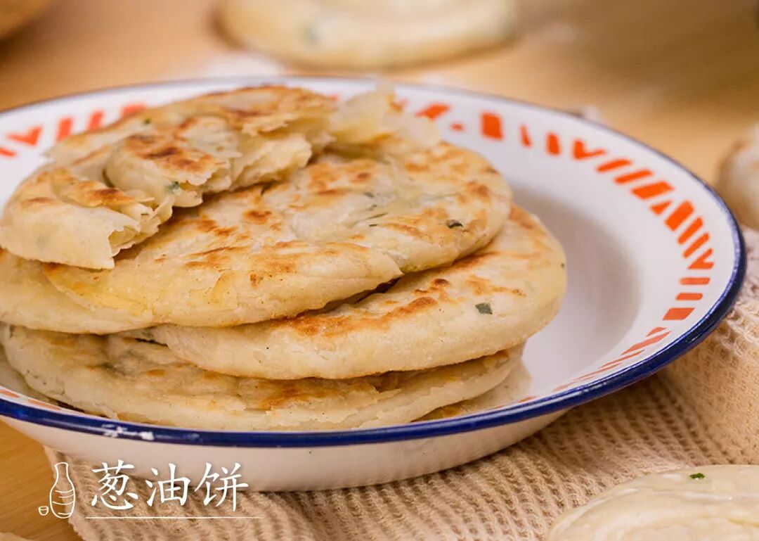 制作葱油饼的关键是起酥,葱花比例也讲究。面团经过两次盘起擀平才能下锅煎,葱香四溢,十分满足!
