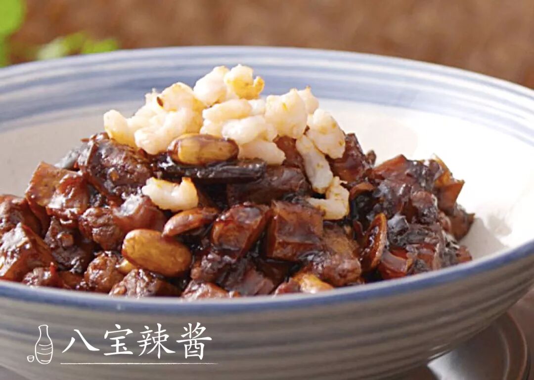 甜辣 上海人的精细在做八宝辣酱时可见一斑。八种配料用辣椒酱、豆瓣酱、甜面酱三种酱料炒制,微辣中带一丝丝甜,配饭也是一流。