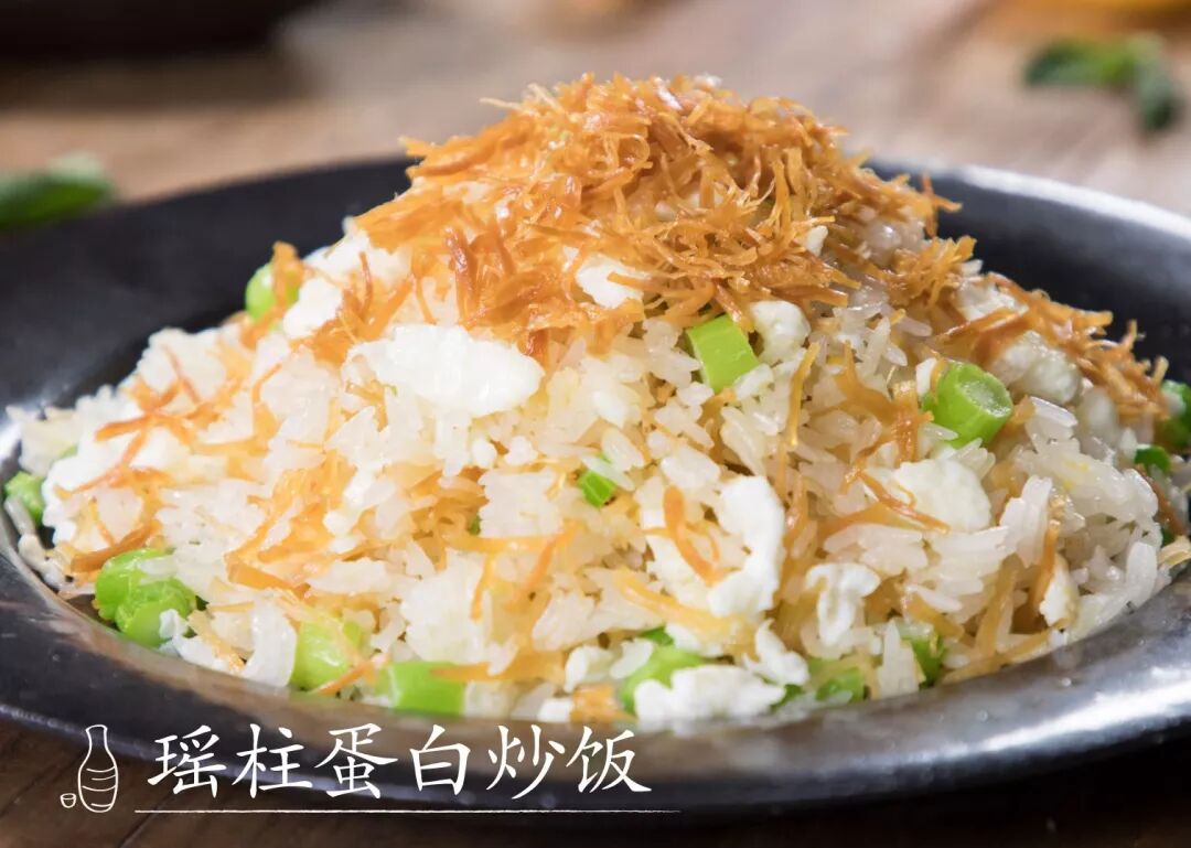 如何把家常炒饭做得惊艳,一是配料,二是色泽。这款粤菜里最经典的炒饭,只用蛋白,瑶柱丝则有蒸熟、油炸两种,与米饭、菜粒混合翻炒,颜色清爽,口感丰富,虽清淡却有着极致鲜美。