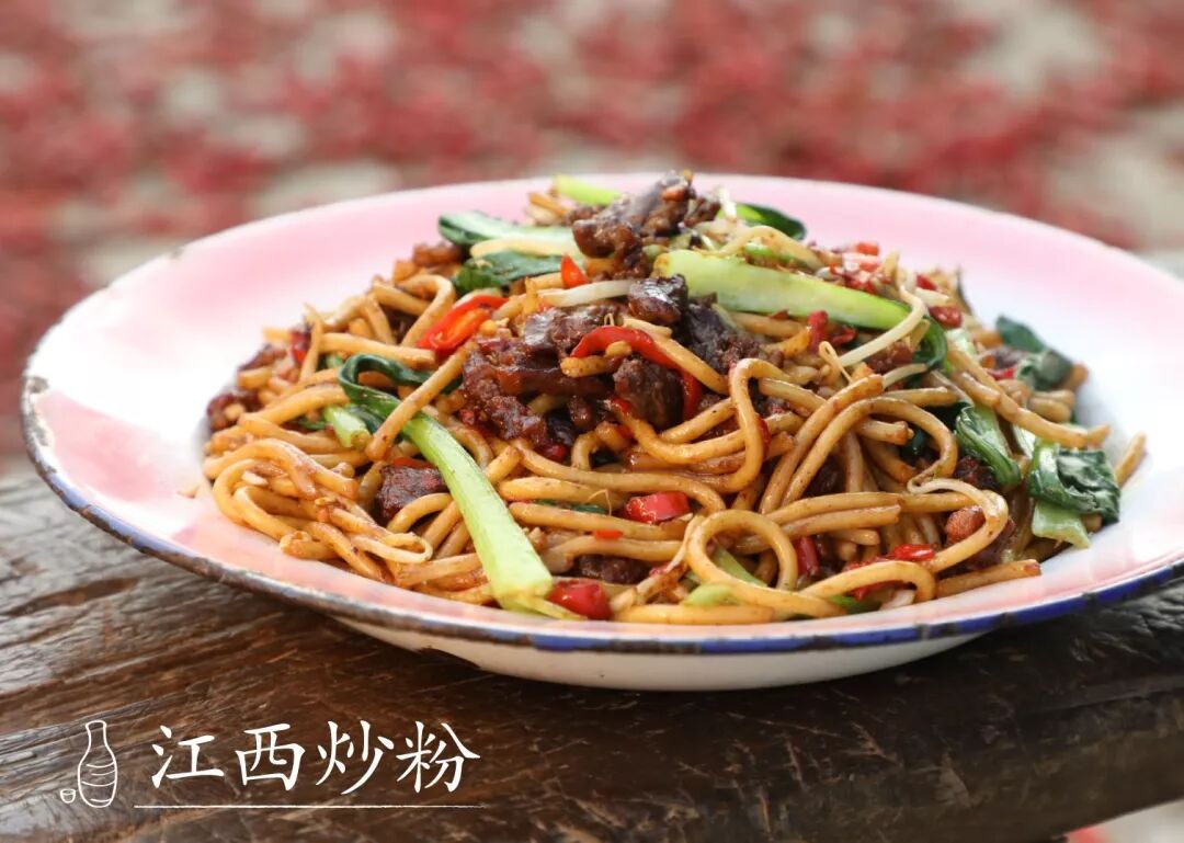 台州炒米粉在于多样的配料,而江西炒粉的精髓则是米粉。当地使用发酵过的土扎粉,有着更浓郁的米香和韧滑口感。通常加入辣椒、牛肉丝以及蔬菜增加味道层次,香辣爽口,不经意就能吃完一碟。