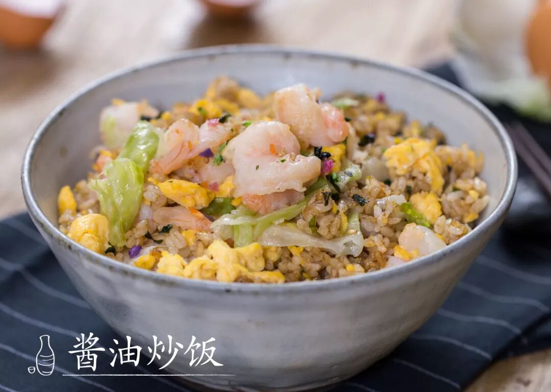 和一般酱色浓郁、酱香扑鼻的酱油炒饭不同,这款日式的酱油炒饭则是清新酸爽,非常适合夏天吃。要点是把酱油熬到粘稠,均匀拌入米饭,再加点虾仁、鸡蛋和球生菜翻炒,生脆又爽口!