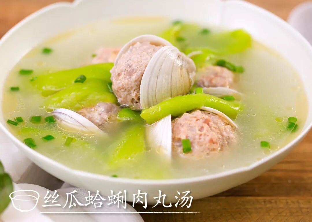 蛤蜊、丝瓜、肉丸是鲜上加鲜的搭配,最妙的是将肉丸包在蛤蜊中,既易定型,又易吸收鲜味。