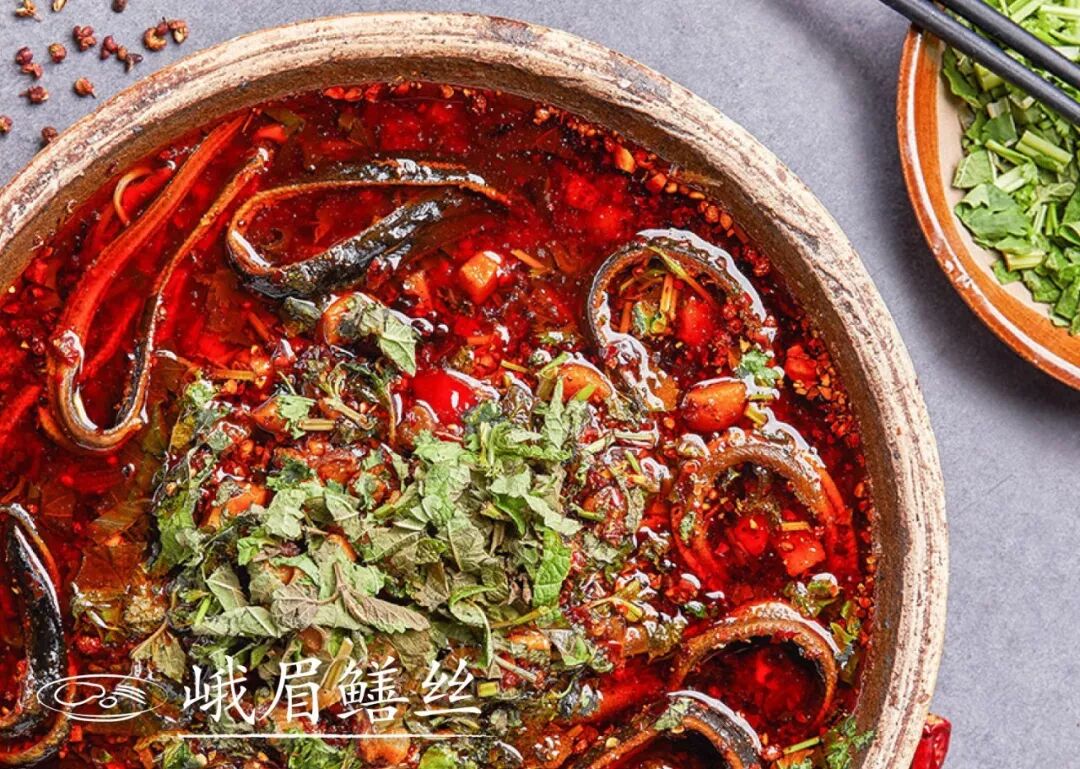 峨眉鳝丝作为峨眉山一带有名的特色江湖菜,汇集川菜的麻辣精髓。鳝鱼本身肉嫩味鲜,搭配多种增色添香的调料和辅料,成菜色泽红亮,麻辣味浓,鳝丝入口滑嫩,吃得过瘾!