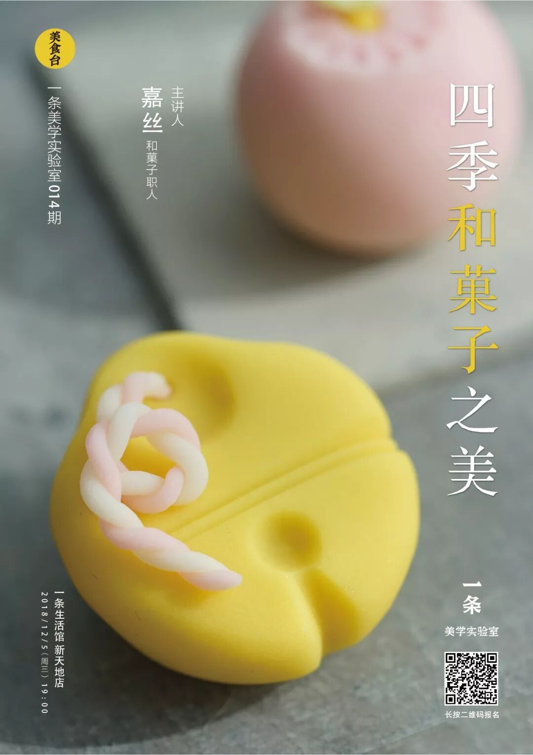 12月5日(周三),我们将在上海一条生活馆的新天地店推出美食体验课的第4期,本次邀请到和菓子职人嘉丝,分享四季和菓子之美。参与者将学习到和菓子的入门知识,免费品尝到独家菓子和抹茶,并有机会亲自捏制两款和菓子。