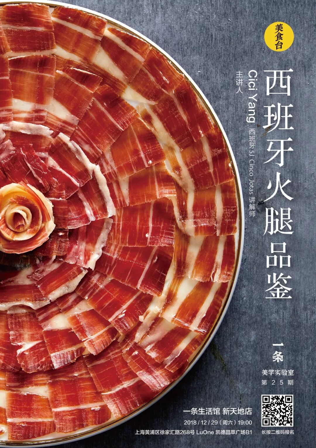 12月29日(周六),我们将在上海一条生活馆的新天地店推出西班牙火腿品鉴课,本次邀请到5J Cinco Jotas品牌的讲师Cici Yang,教大家如何鉴赏最顶级的伊比利亚火腿。从火腿的产地、分类、工艺、味道、香气等,详细阐述西班牙的火腿文化。参与者更有机会亲自切割火腿,体验独一无二的乐趣。现场亦有精美的火腿小食,带给你味蕾的极致享受。