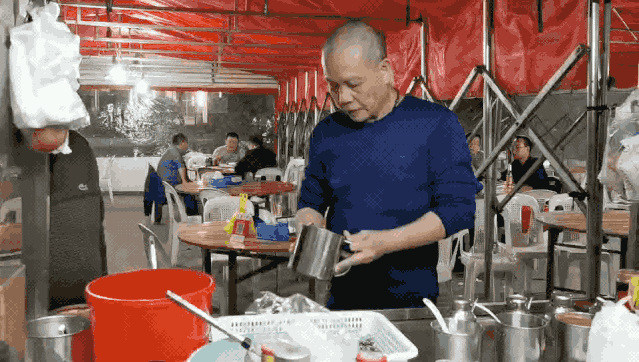 ▲打完菜,吴叔会抓一把自制菜头酸放旁边解腻