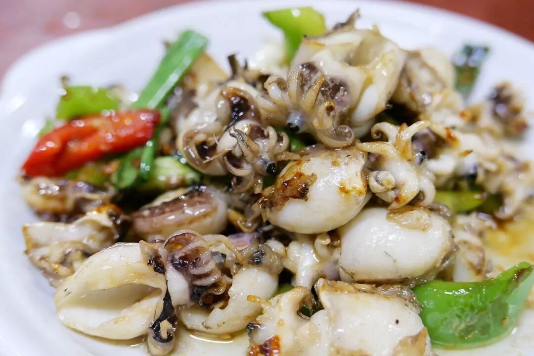 鱿鱼、章鱼、墨鱼这一类的软体动物,除了清蒸、爆炒之外,还可以干煎。干煎小墨鱼煸得干香,边缘有些焦脆,适合下酒。爆炒鳗鱼选用小鳗鱼,油脂没那么重,爽脆弹牙,葱香四溢。
